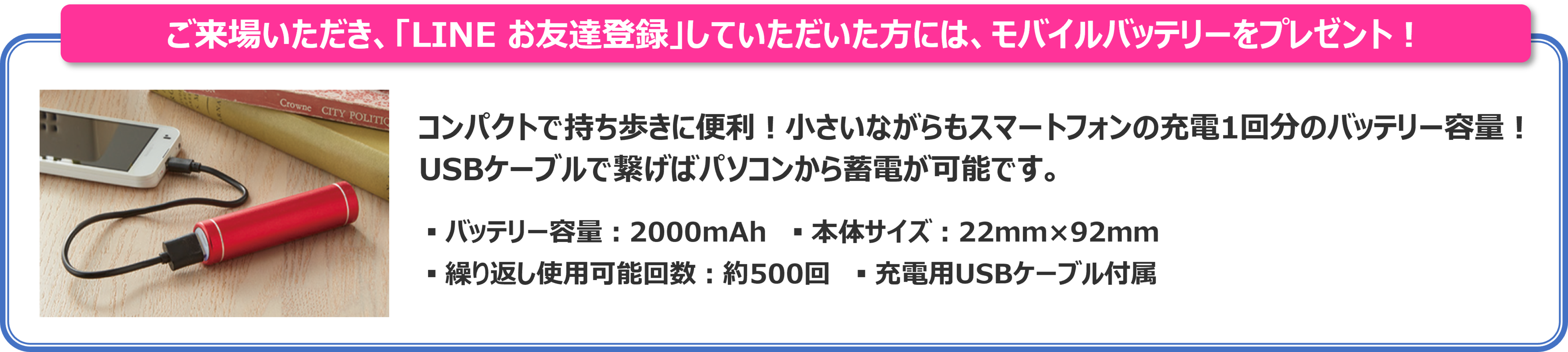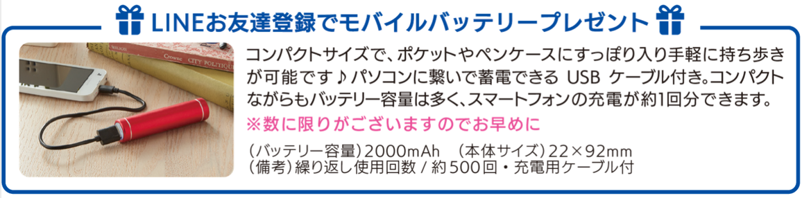 LINEお友達登録でモバイルバッテリーをプレゼント!