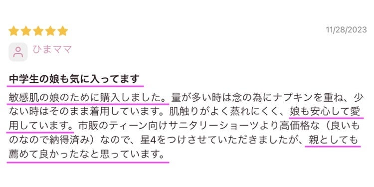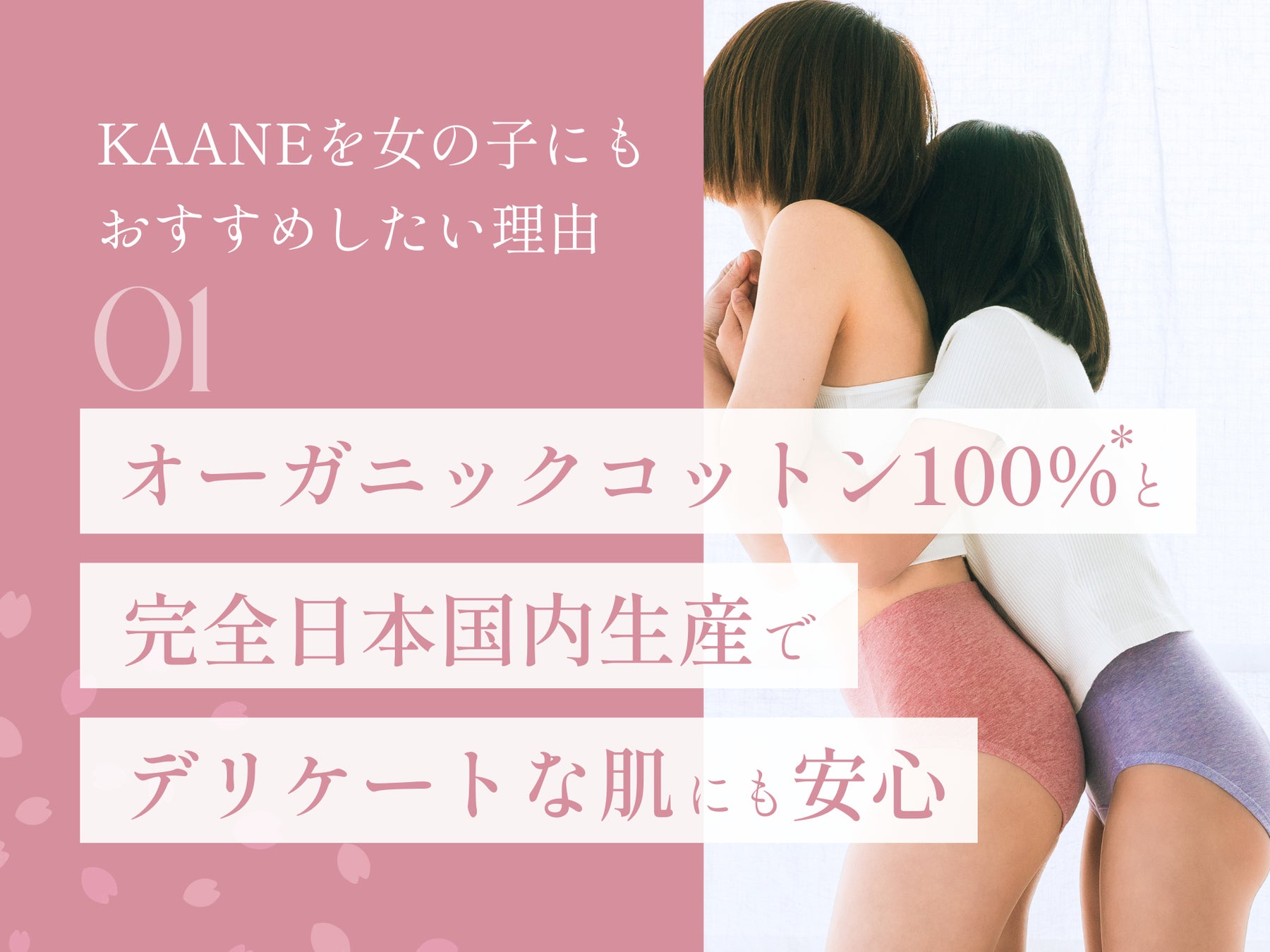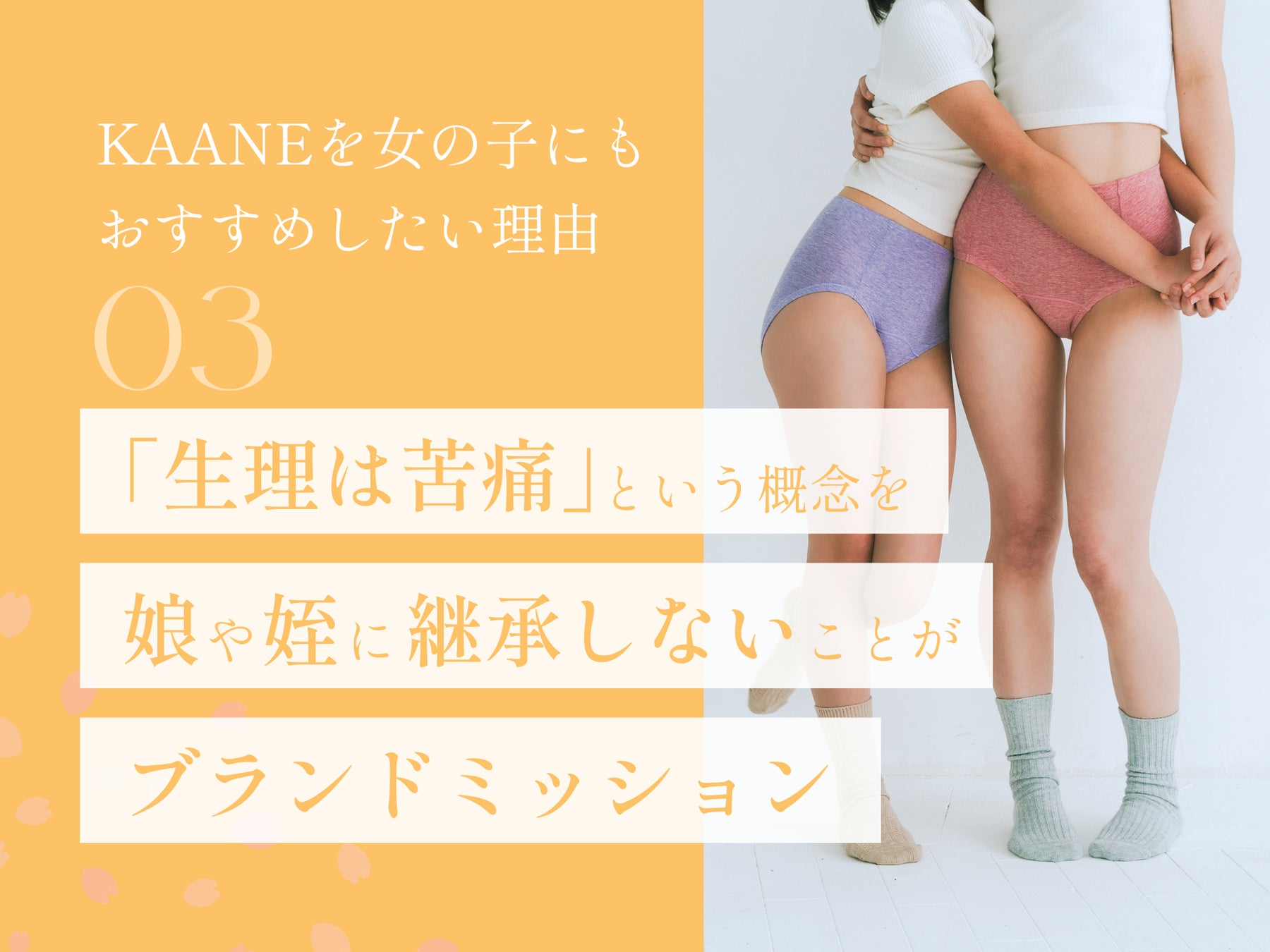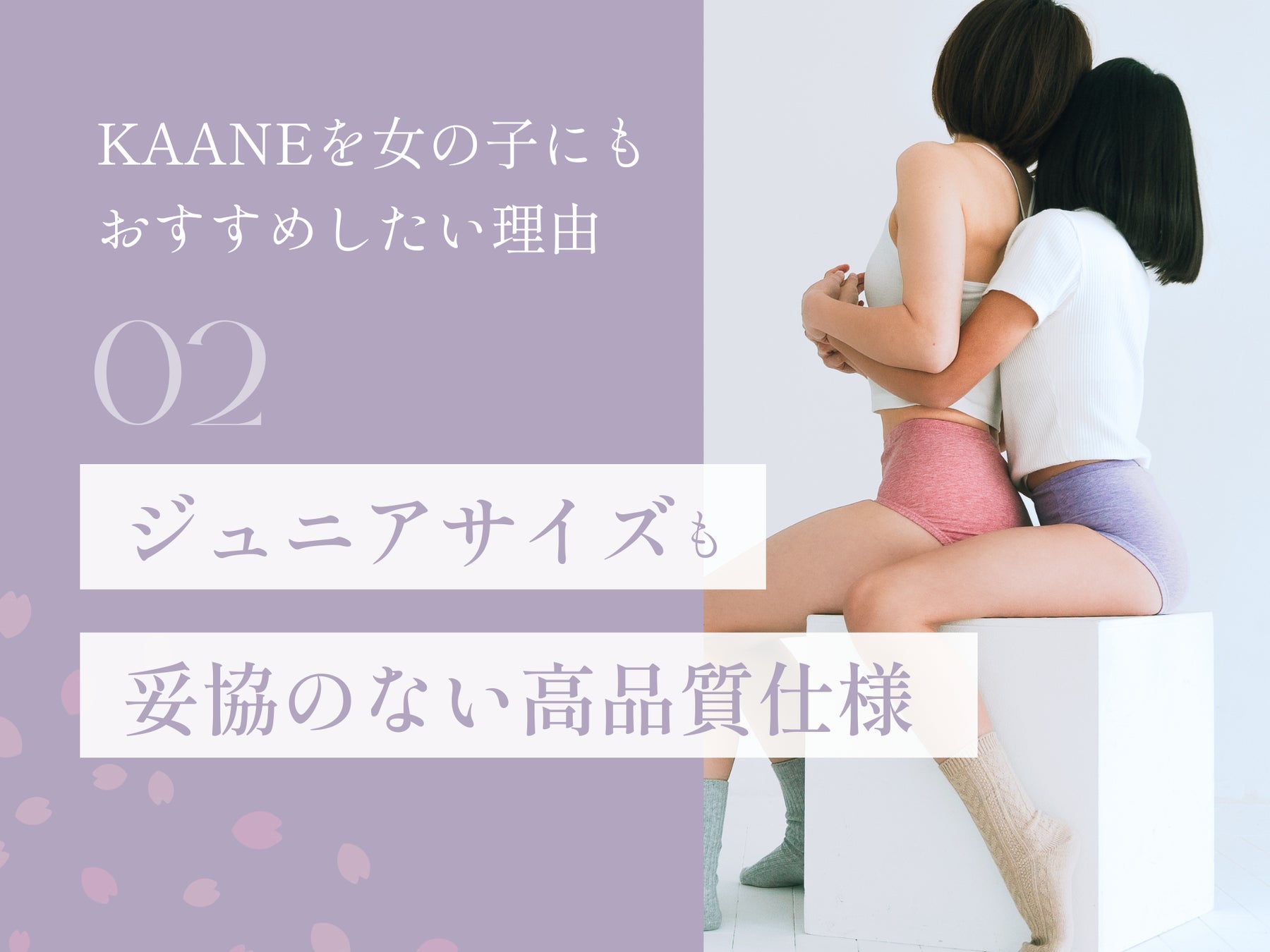 KAANEでは「娘や姪の世代に"生理は苦痛"という概念を継承しない」事をブランドのミッションとしており、その想いとお客様からの多くのご要望もあり、2024年にジュニアサイズの「KAANE JUNIOR」も発売開始しております。