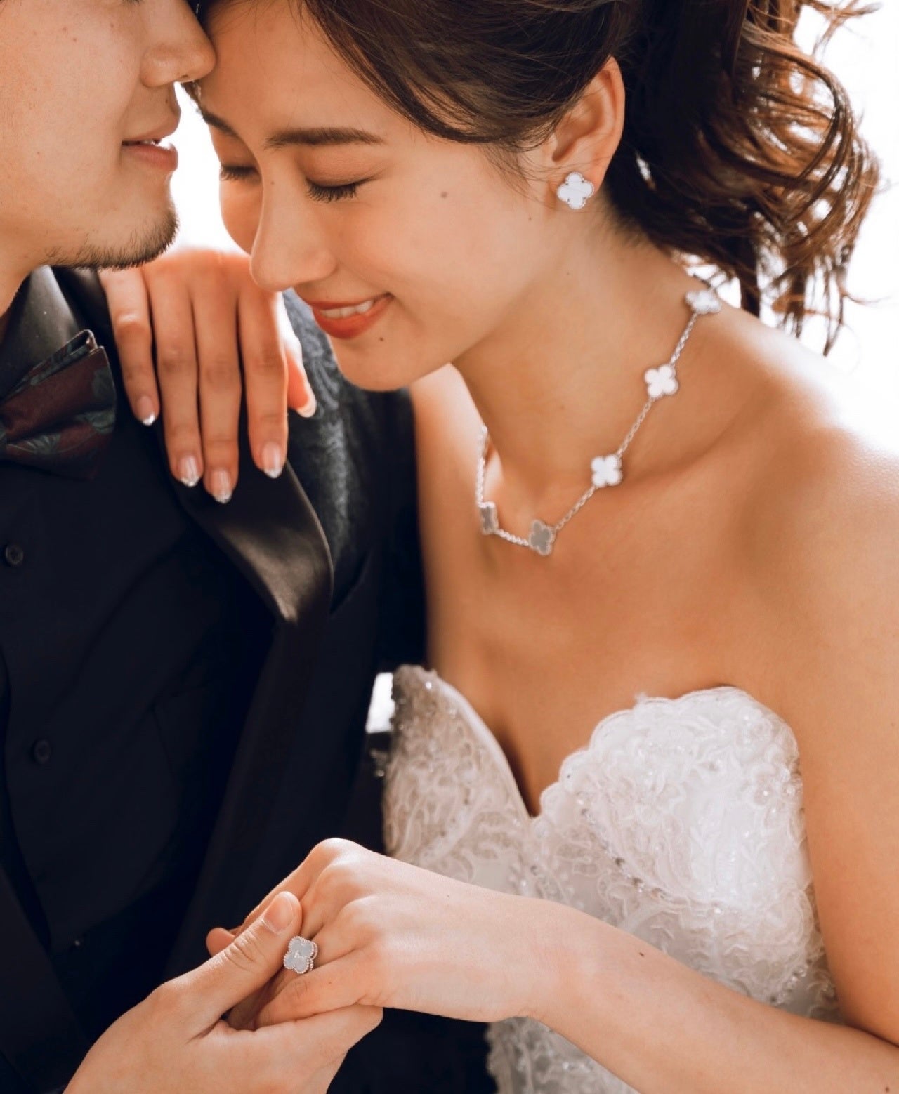 以前インスタグラムでヴァンクリーフのアルハンブラを身につけた花嫁の写真がきっかけで、自身が花嫁になった時、ウェディングドレスだけではなくジュエリーもこだわりたいと思いました。