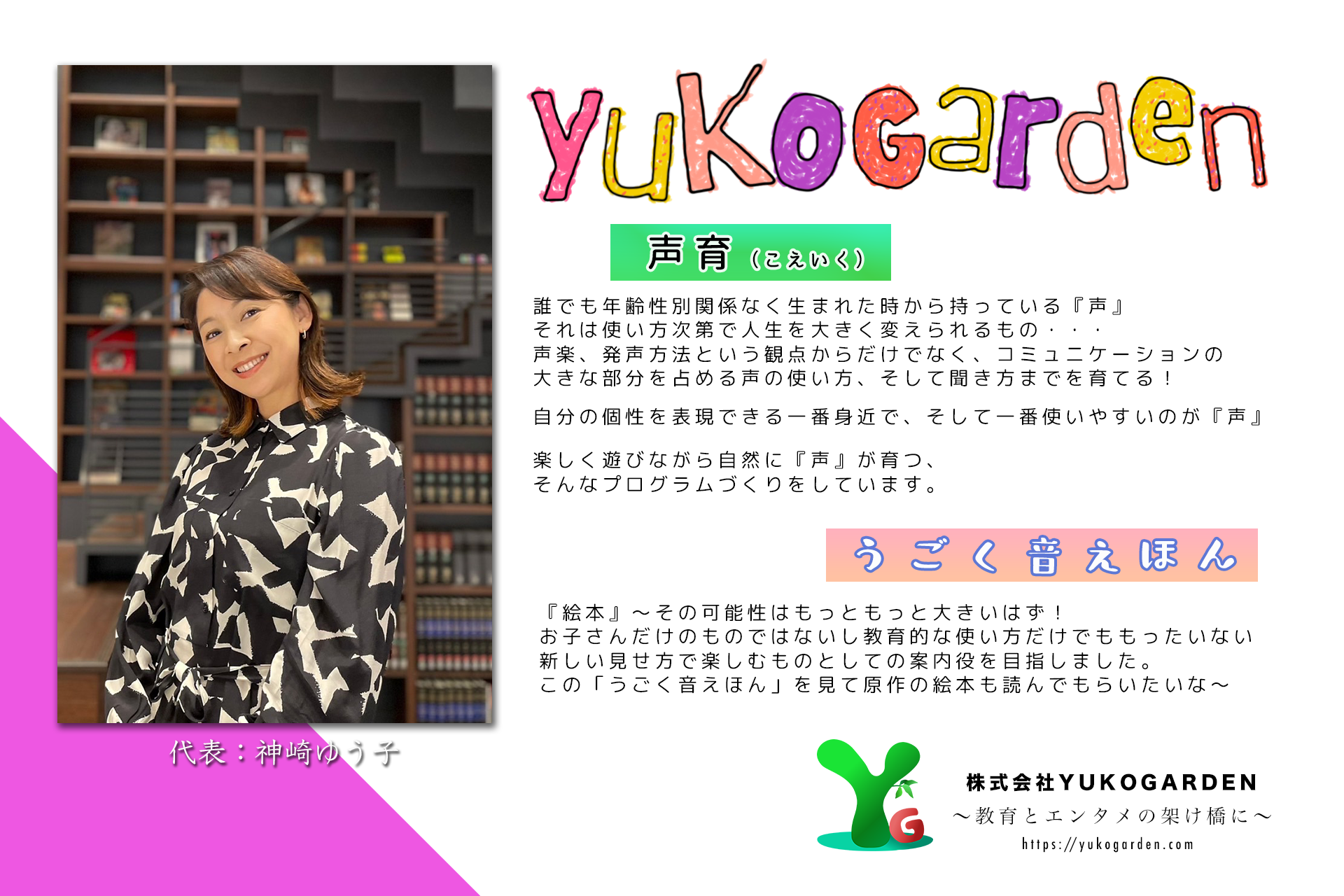 ・私生活でも二人の子どもを持ち、働きながら子育てをするという体験を経て、今の時代に同じような時期を過ごしている親世代を手助けできる活動をしたいと思い、自分が積み重ねてきた『声』の力を中心として子育ての中に「教育に楽しさをプラス」できるような提案をしていきたいと2021年に株式会社を立ち上げ、一緒に遊べる場所へいらっしゃいという想いを込めて「YUKOGARDEN」と名付けた。