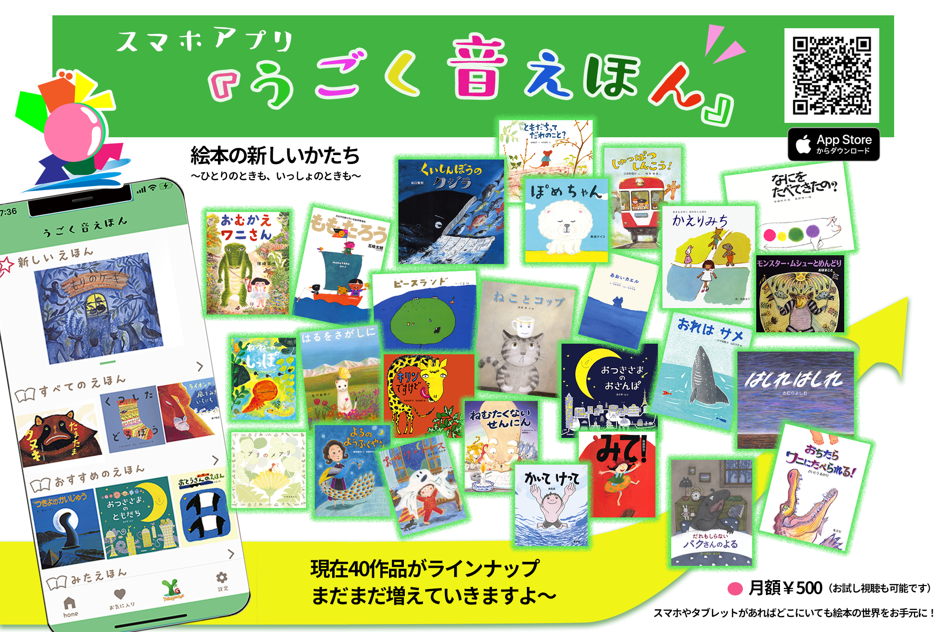 こんな作品を空の上で楽しんでいただけたら、次はスマホアプリでもっとたくさんの『うごく音えほん』を楽しみませんか?移動先でもういちどあの作品が見たい、とかもっとあんな動画ないの?気に入ってもらえたらこちらから見つけられますよ!