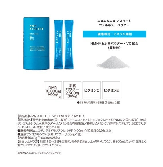 話題のエイジングケア(年齢に応じたケア)物質「NMN」と「水素」を融合した新商品”NMN ATHLETE WELLNESS POWDER"発売開始