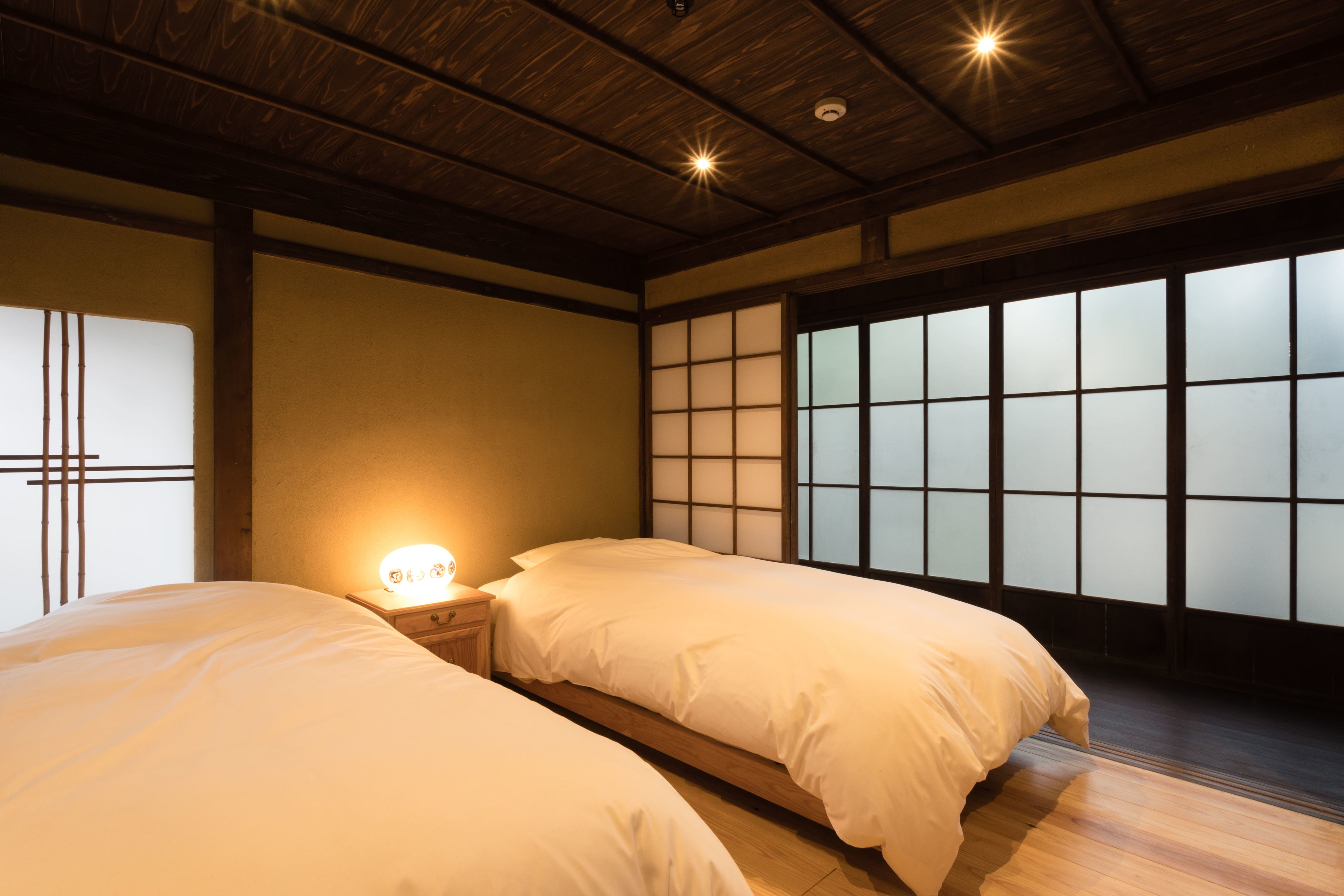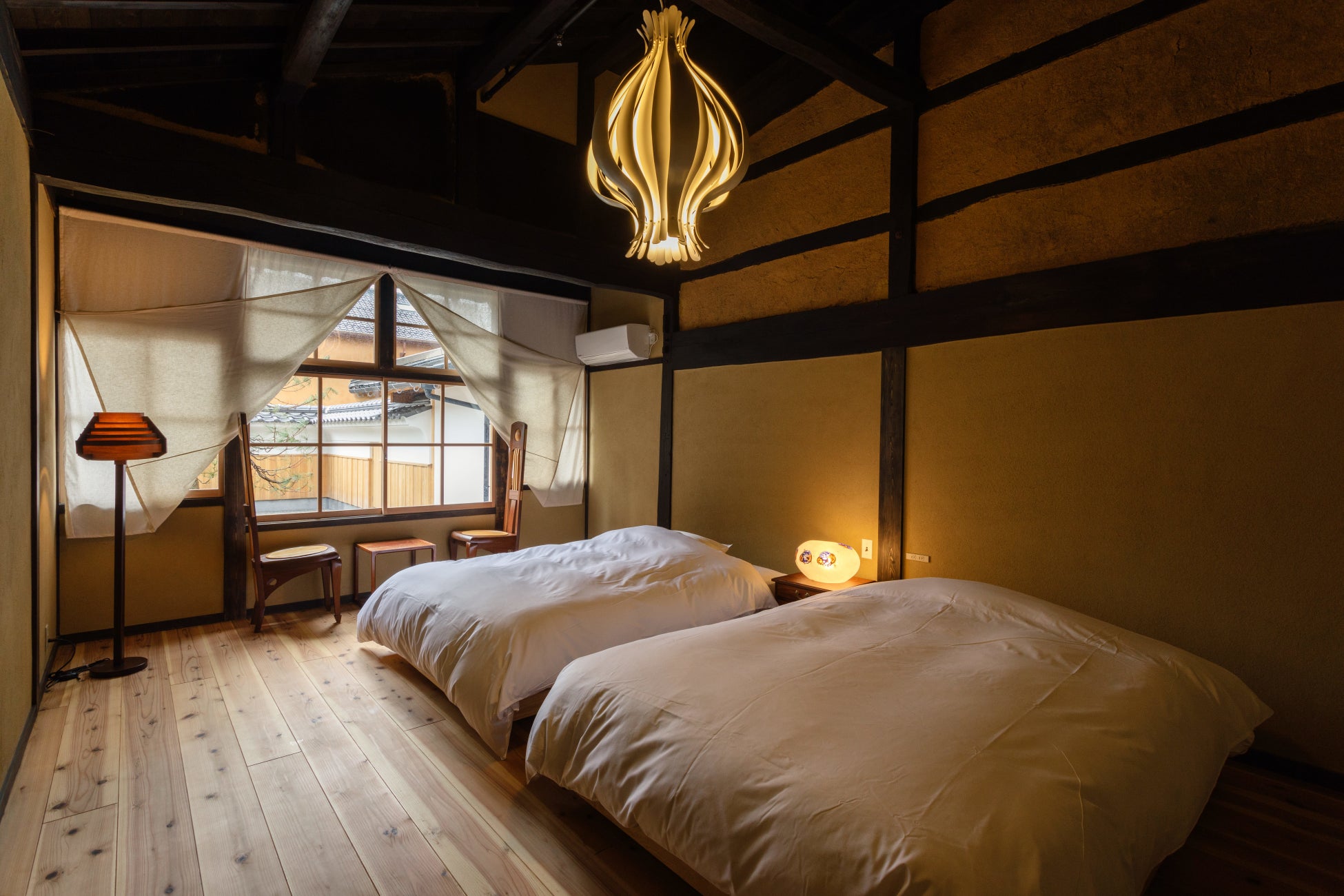 長い年月を超えてきた梁と温かみのある土壁、アンティークの家具、陰影の美しい柔らかな光を注ぐ照明に包まれ、日本でありながらどこか異国情緒漂う客室です。