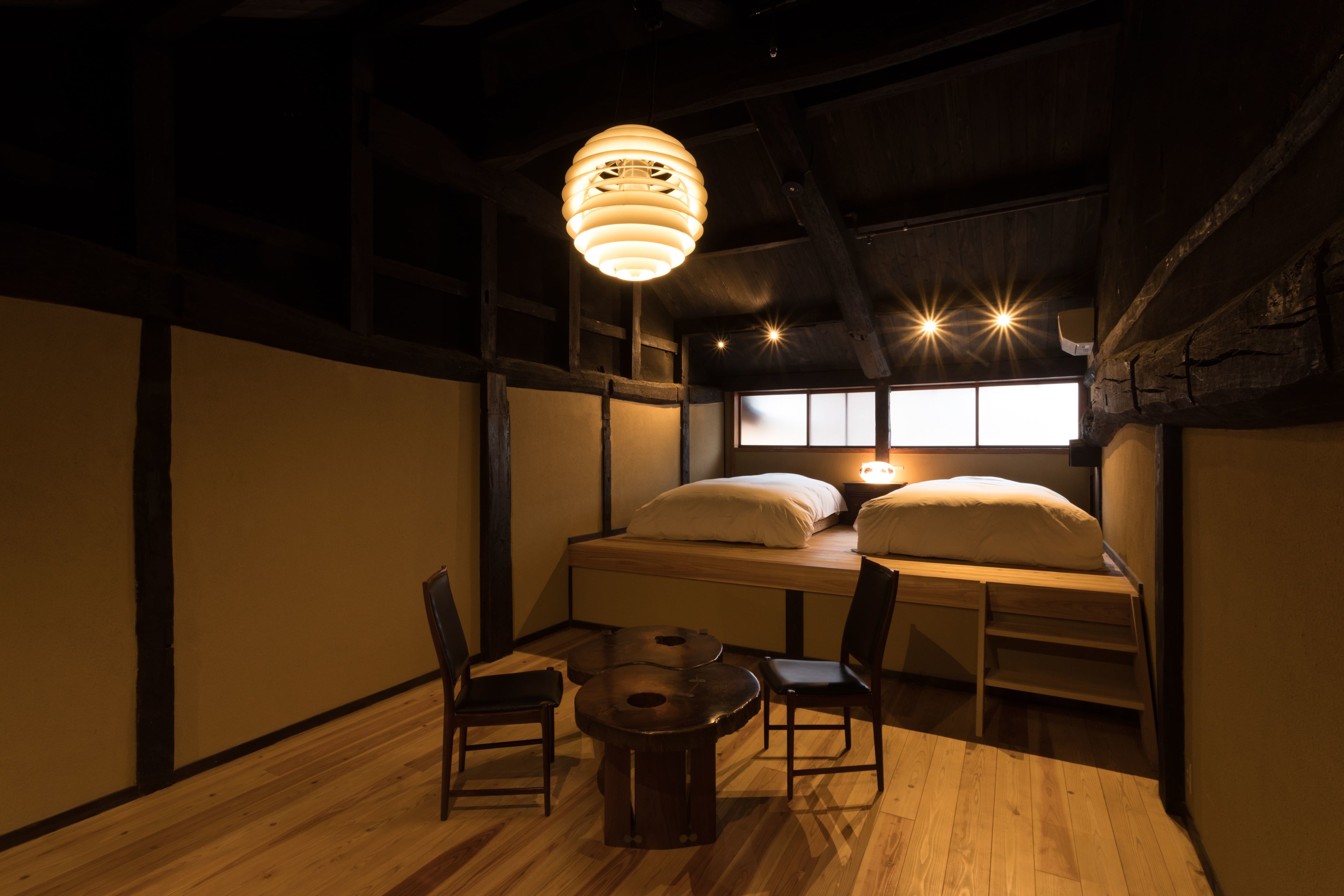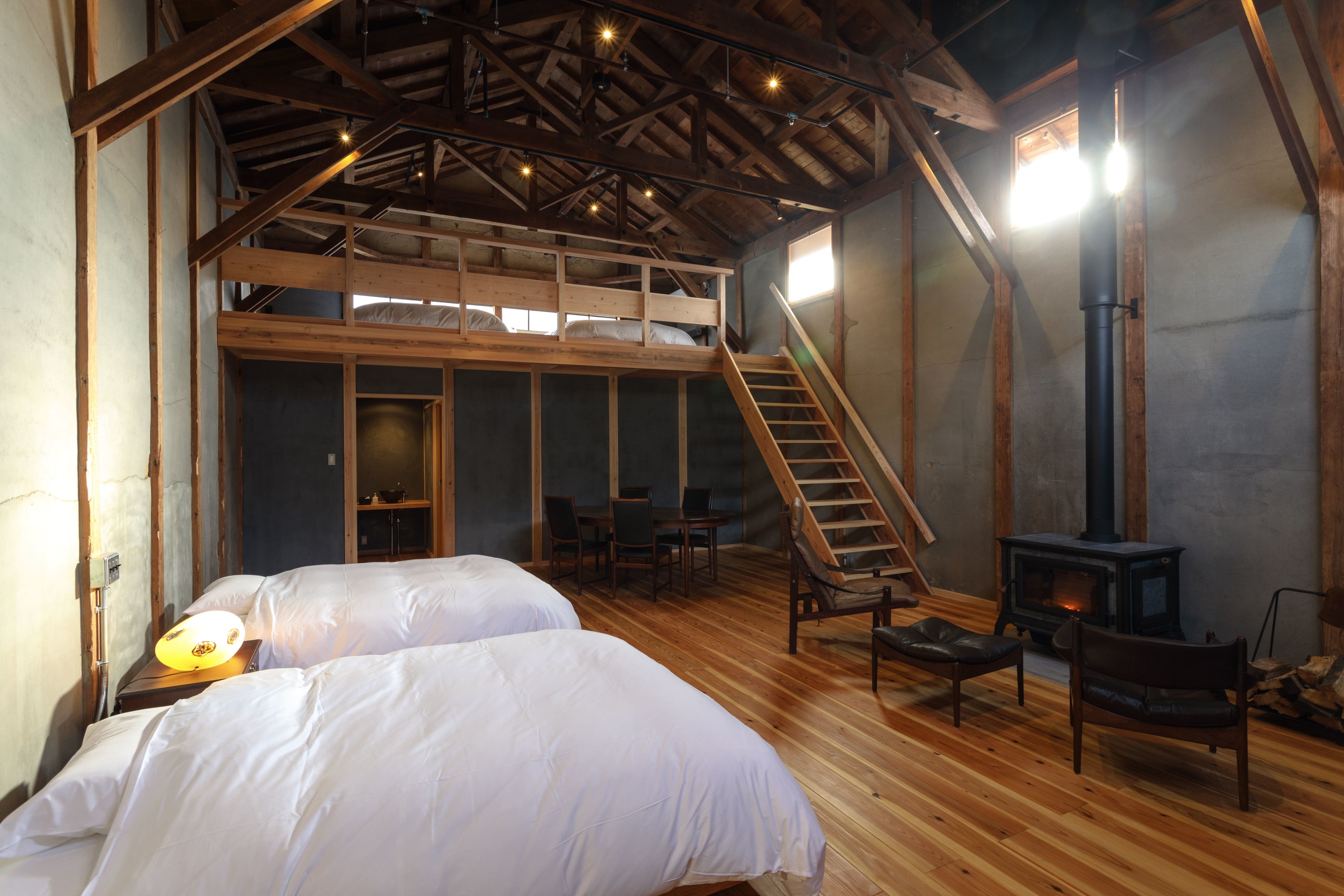 酒米や道具を大切に保管した蔵をそのままに、1階は、薪ストーブの炎を眺めながら広々と寛ぐことのできるスペースに、2階はロフトの寝室を備えた開放的な客室です。