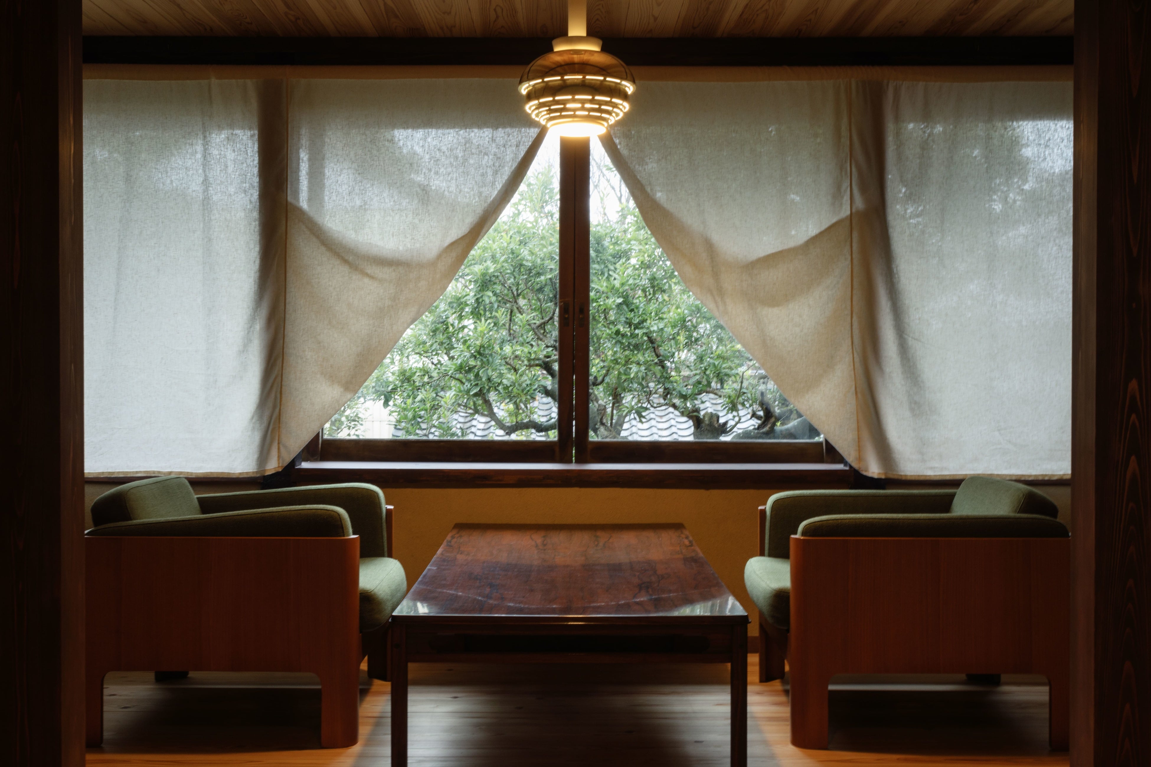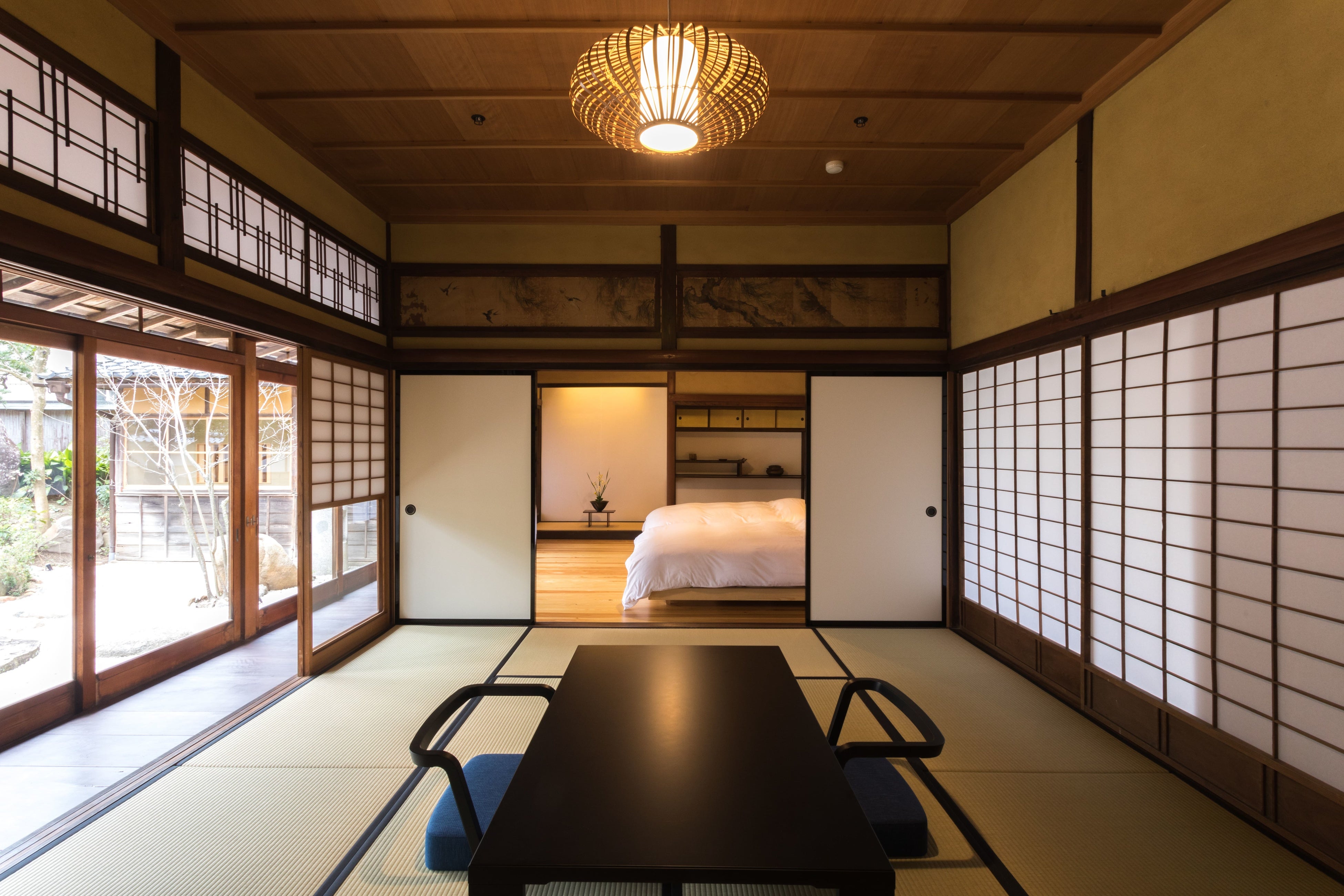 1本松の小庭を眺める和室と寝室からなる、落ち着いた程よい広さの客室です。かつては蔵人の台所や茶室としても使われ、飾らない空間の心地よさを感じます。