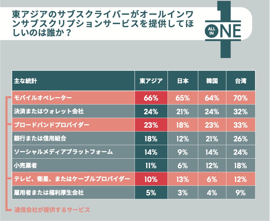 通信事業者は既にコンテンツのバンドリングにおいて中心的な役割を果たしており、これを拡大することで、65%の日本の加入者が求める「オールインワン」のサブスクリプションサービスを提供できる可能性があります。スーパー・バンドリングは、消費者が求めるこのニーズを満たし、より強力な顧客基盤を構築するチャンスです。