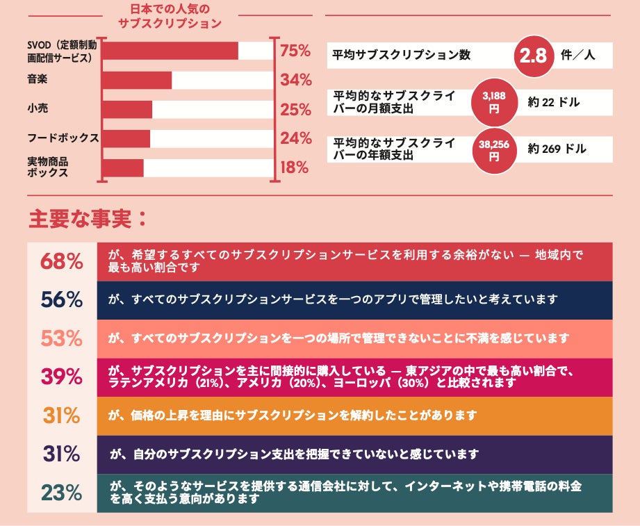 複数のサブスクリプションのコストは、日本の家庭にとって負担となっています。加入者は月平均3,188円を支払い、年間では38,256円に達します。68%の日本の加入者が、すべての望むサービスを利用することができないと回答しており、31%は価格の上昇により少なくとも1つのサービスを解約しています。