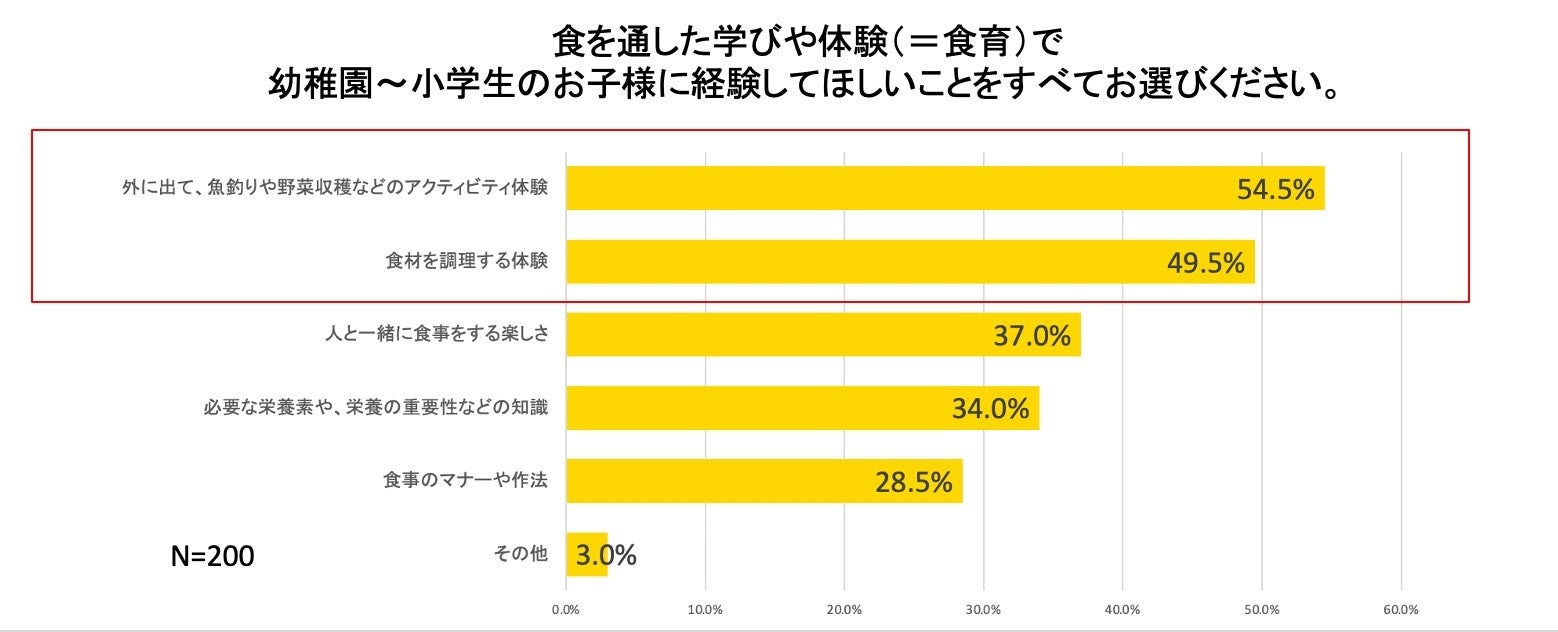 子供への食を通じた体験や学びに関心があると回答した親は83.5 %、さらに82.0%が体験の機会を増やしていきたいと回答。経験してほしい事は、「外に出るアクティビティ体験」「食材調理」がTOP2になった。