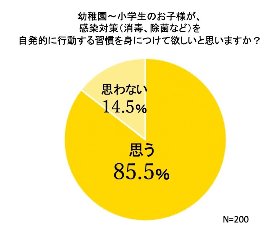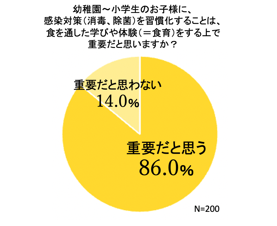 86.0%の親が、感染対策(消毒、除菌)を習慣化することは、食を通した学びや体験(=食育)をする上で重要だと回答。さらに、85.5%の親が、感染対策(消毒、除菌など)を自発的に行動する習慣を身につけて欲しいと思うと回答。