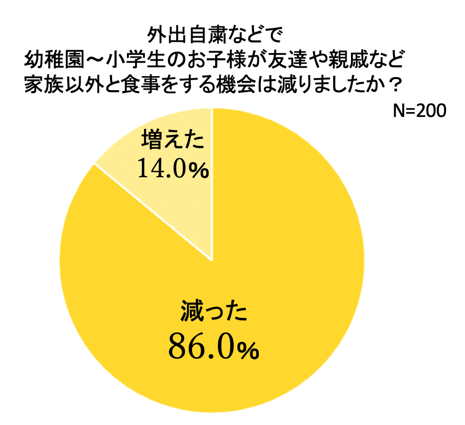 85%が、2年前と比べて家族で食事を取る機会が多くなったと回答した一方で。外出自粛などで、子供が友達や親戚など家族以外と食事をとる機会が減ったと回答した方が86%という結果になりました。