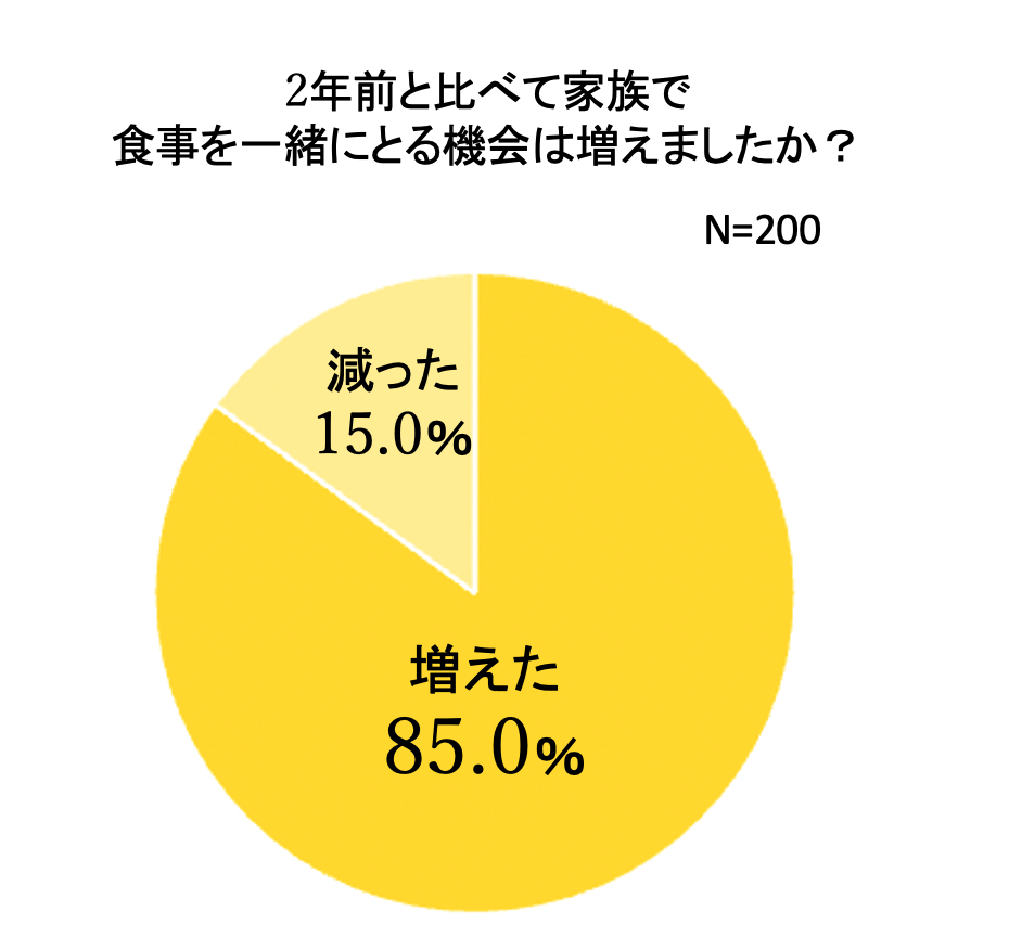 └2年前と比べて8割以上の家庭が、家族で食事を一緒にとる機会は増えている。