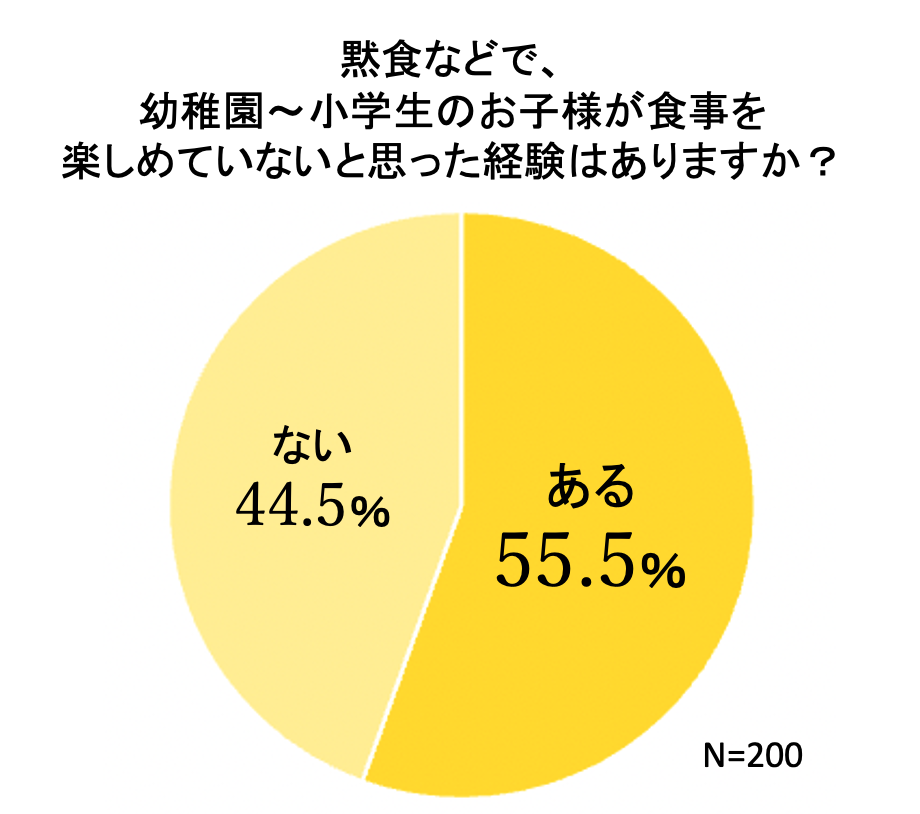 55.5%の親が、黙食などの理由で、子供が食事を楽しめていないと思ったことがあると回答しました。更に、楽しめていない理由を聞くと「外食が減ったから」「保育園でも黙食の為、友達と話す機会が少ない」「楽しく会話しながら食事ができないので暗い雰囲気になっている」という意見も多くありました。