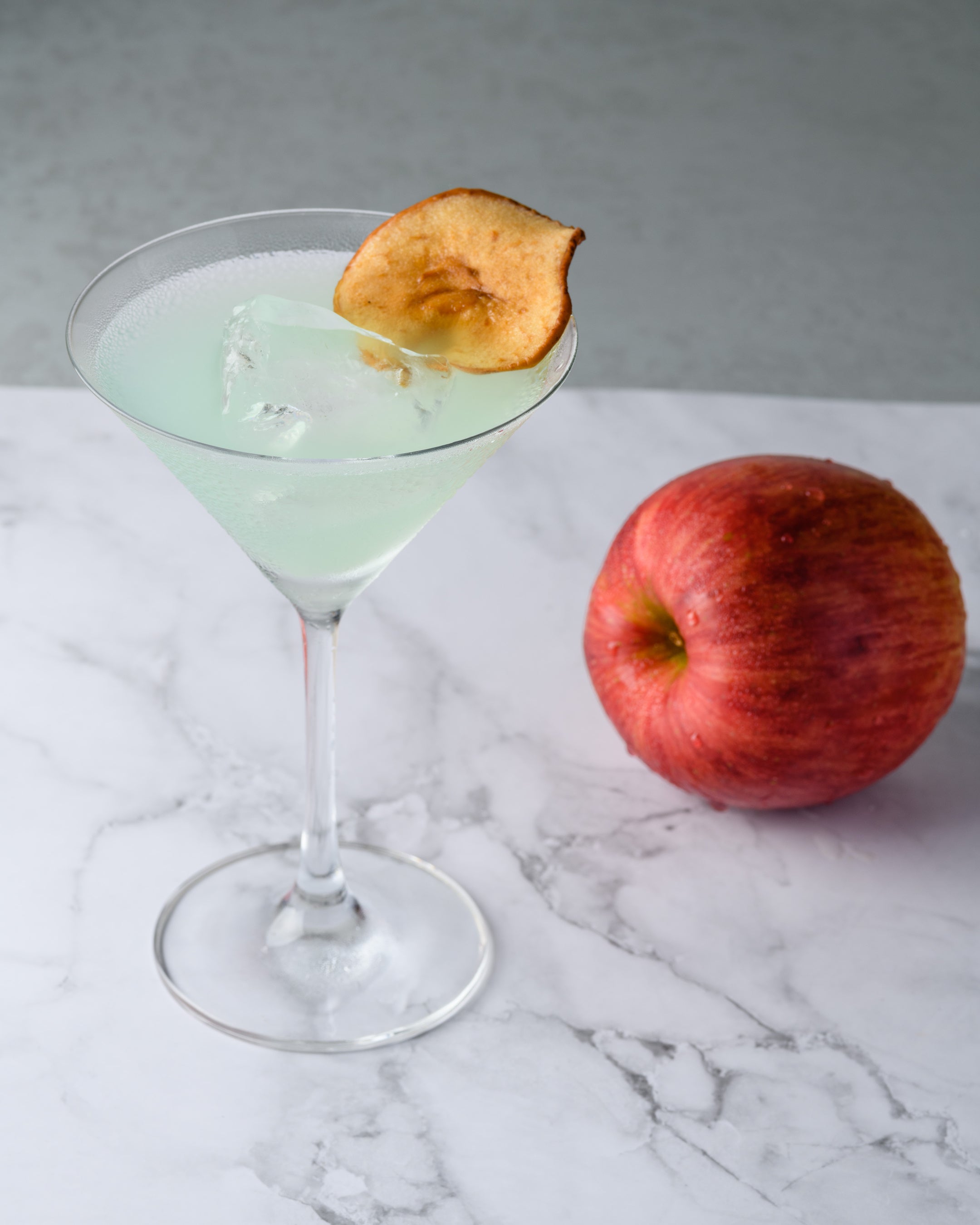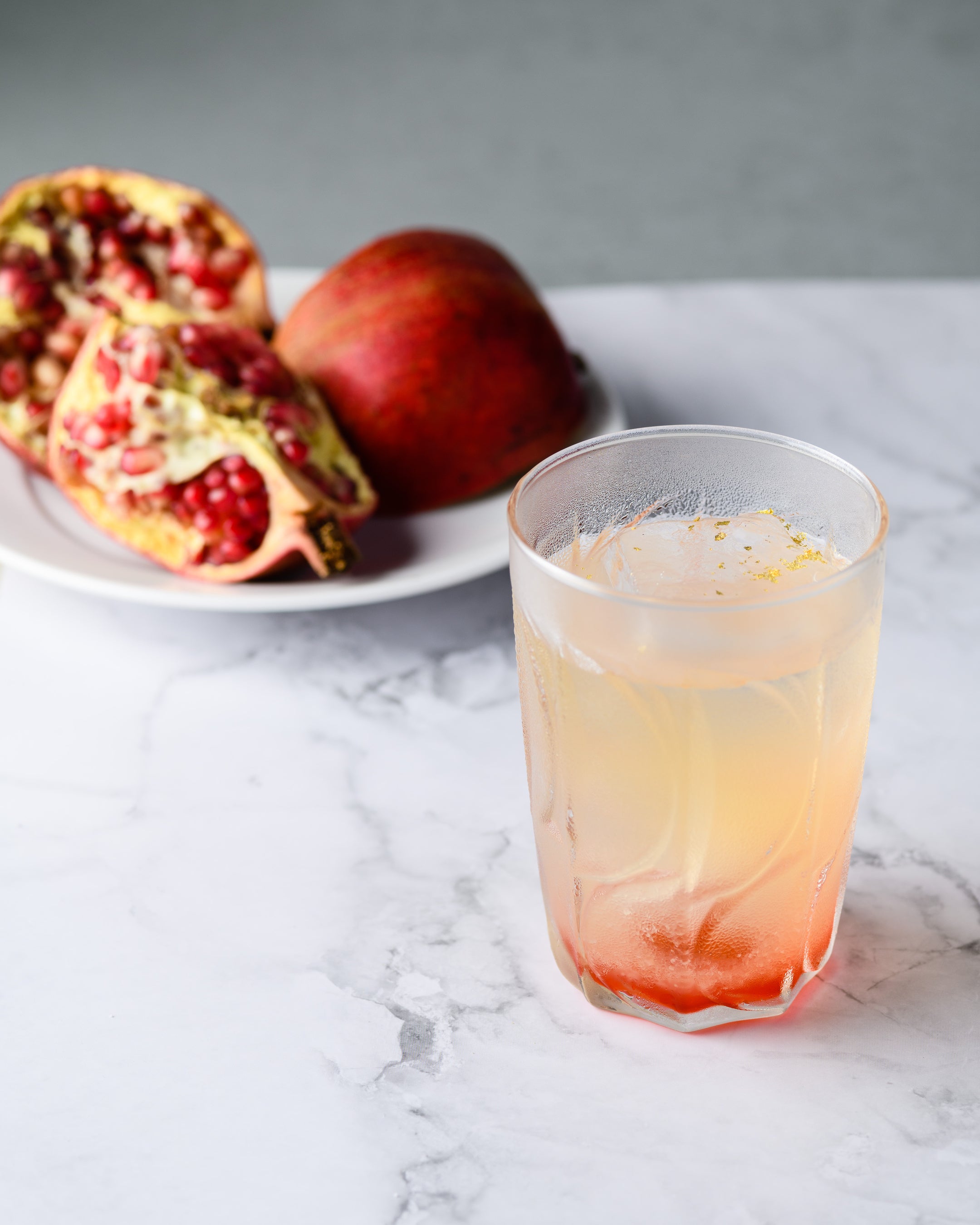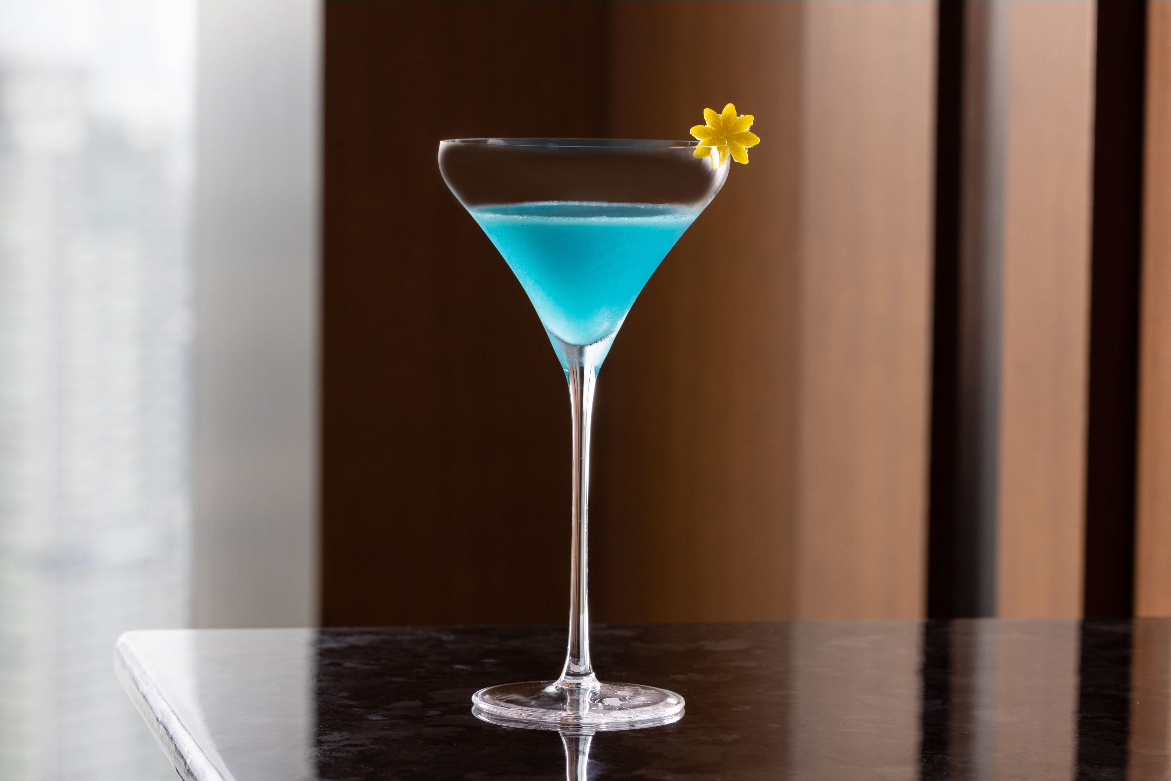 丸いグラスには、淡いブルーの液体に氷の塊が浮かんでいる。