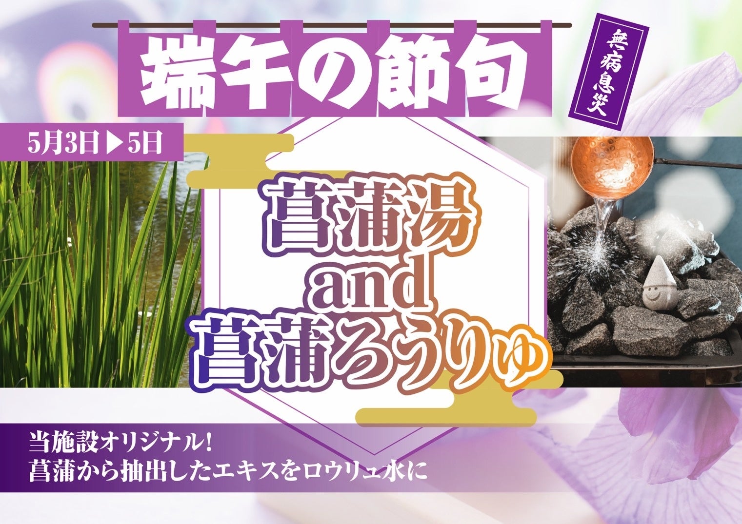 ゆうだい温泉では、期間中に約300本の菖蒲の葉を湯船に浮かべた「菖蒲湯」と、菖蒲の葉を煮だしたアロマ⽔を⽤いたサウナ室での「菖蒲ロウリュ※」を開催し、ご来館いただくお客さまの無病息災を祈念致します。