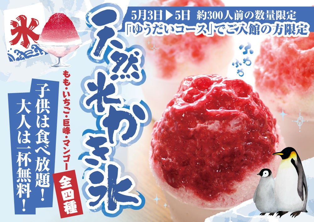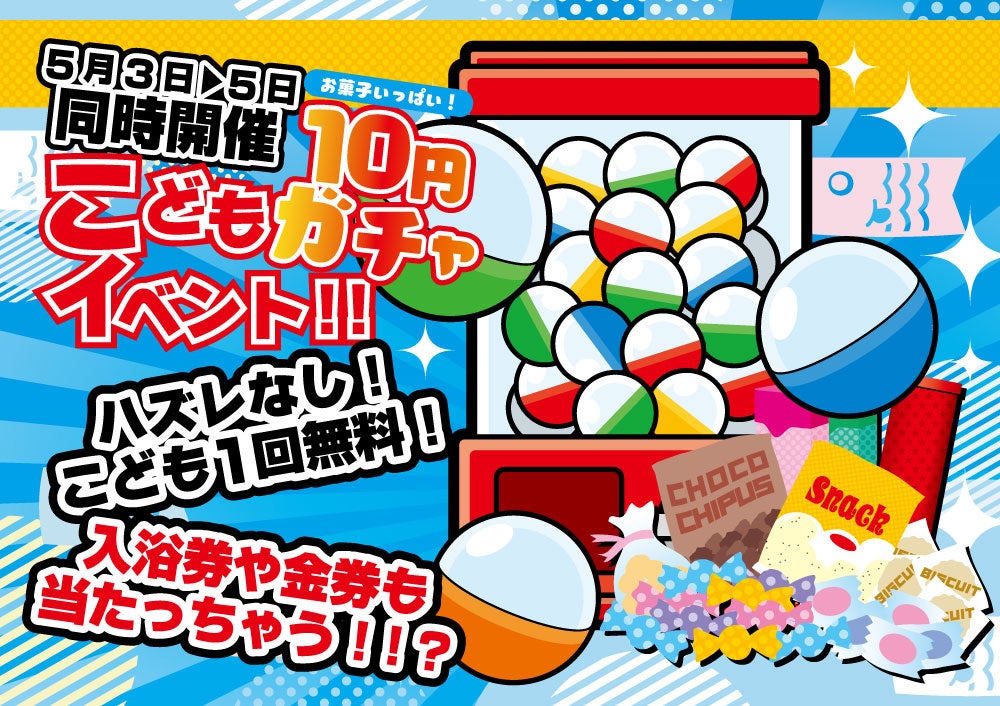 また、この期間内に、お子様向けのガチャイベント、ゆうだいコース(コロッケ・館内着つき)でご入館の方は天然水を使ったふわふわかき氷1杯無料(お子様は食べ放題)などのサービスも実施し、親子でご来館いただく皆様の思い出作りをサポートいたします。