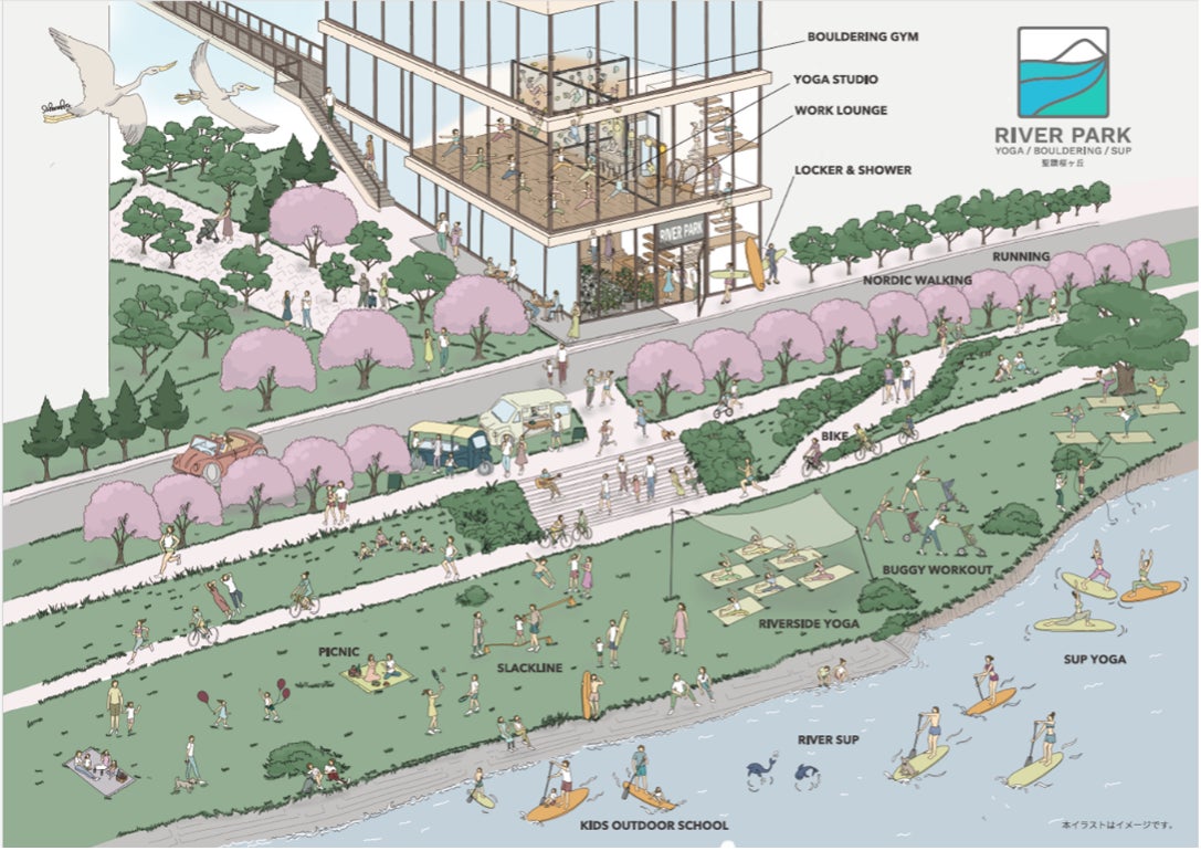 本事業は、聖蹟桜ヶ丘駅から徒歩5分の立地に開業予定の商業施設「サクテラスモール」で、多摩川を活用したリバーSUP、屋内施設でヨガスタジオ・ボルダリングなど複合的な会員制アウトドアフィットネス事業を展開するものです。