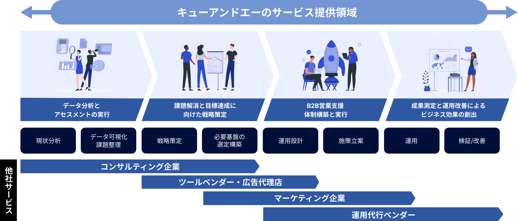 こうした課題に対してキューアンドエーは、業界・業態、大手~中堅・中小企業問わず、幅広くIT 支援を手掛けた実績や知見を活かし、「営業DX(コンサルティング/デジタルマーケティング/インサイドセールス/カスタマーサクセス)」サービスを展開し、Webとデジタル基盤を活用した営業プロセスを構築。経営課題の解決に向けた戦略策定から継続的なPDCA、プロジェクトの進行、運用までワンストップで支援いたします。