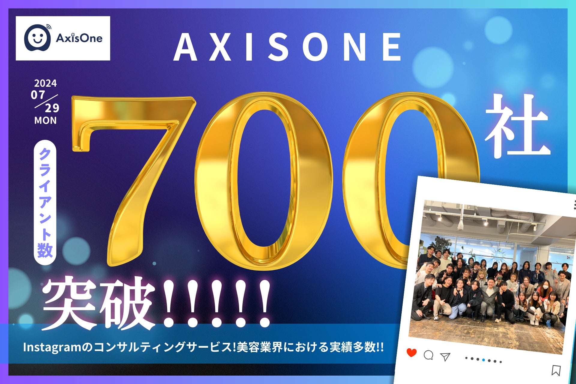 Instagramコンサルティングサービスを展開する株式会社アクシスワン(本社:東京都中央区、代表取締役:岡田 史也、以下「アクシスワン」)は、2024年7月29日(月)時点でクライアント数700社を突破したことをお知らせいたします。