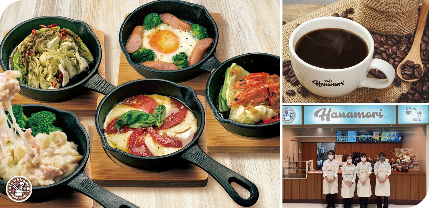「Cafe Hanamori」では、豊富なカフェメニューやスイーツに加え、アルコール、バルメニューもご用意。フードコートのように“カフェ”の枠にとらわれない様々なサービスを1店舗で実現しております。