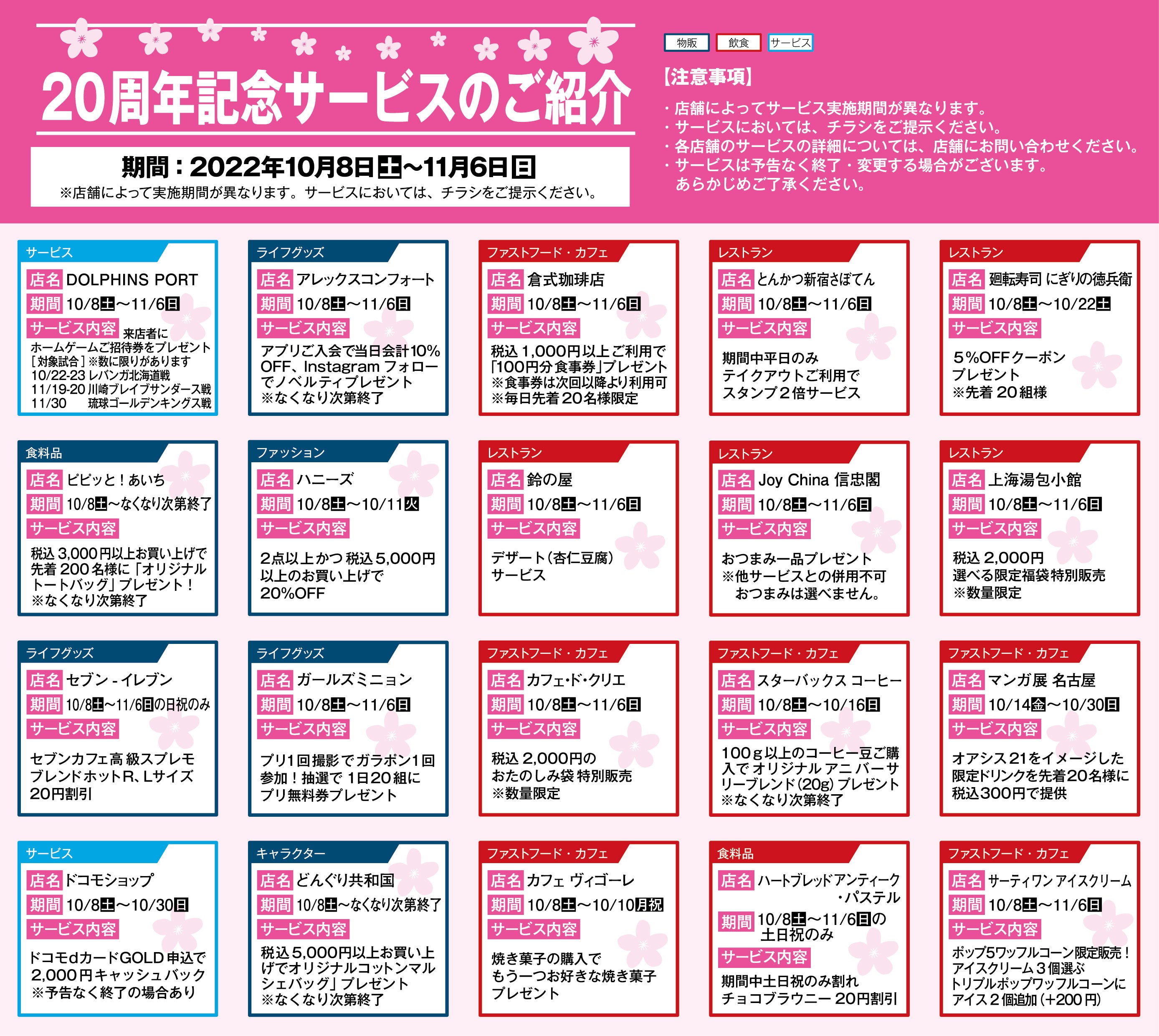 オアシス21内にある20店舗にて周年を記念した期間限定の特別サービスを提供します。