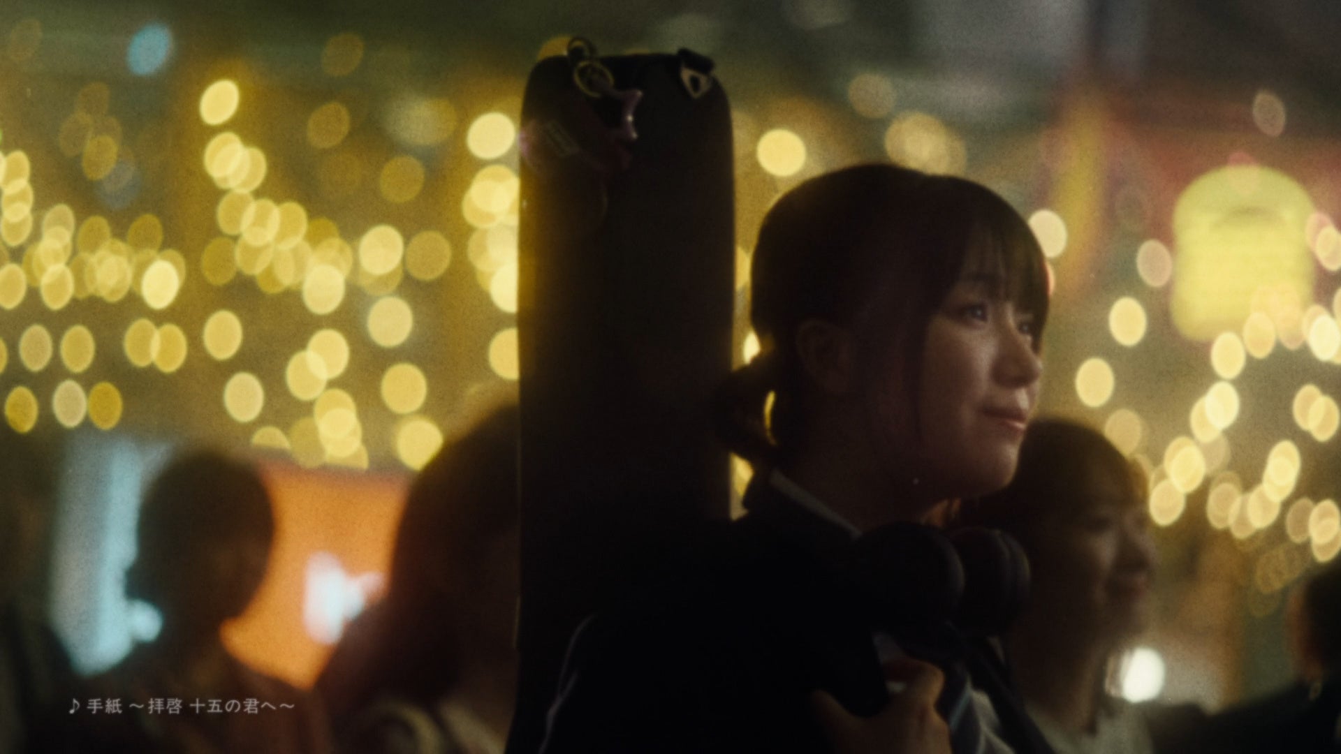 人が行き交う街角で、「手紙 ~拝啓 十五の君へ~」を歌う池田エライザさん演じる女性シンガー。その歌声に、通行人たちは足を止め、やがて周囲には人の輪ができます。そこへ、ギターを背負う学校帰りの女子高校生が通りかかります。不安や孤独を抱えながらも自分の居場所を見つけようと歌手を夢見る彼女は、ヘッドホンを外して立ち尽くし、その歌声と歌詞に心を優しく包まれます。また、「一人は好き」と書かれたSNSの画面を見つめる青年や、知人と暇をつぶしながら「孤独は嫌い」と落書きする女子大学生など、複雑な感情を抱えながらも現代を生きる人たちの姿が描かれています。
