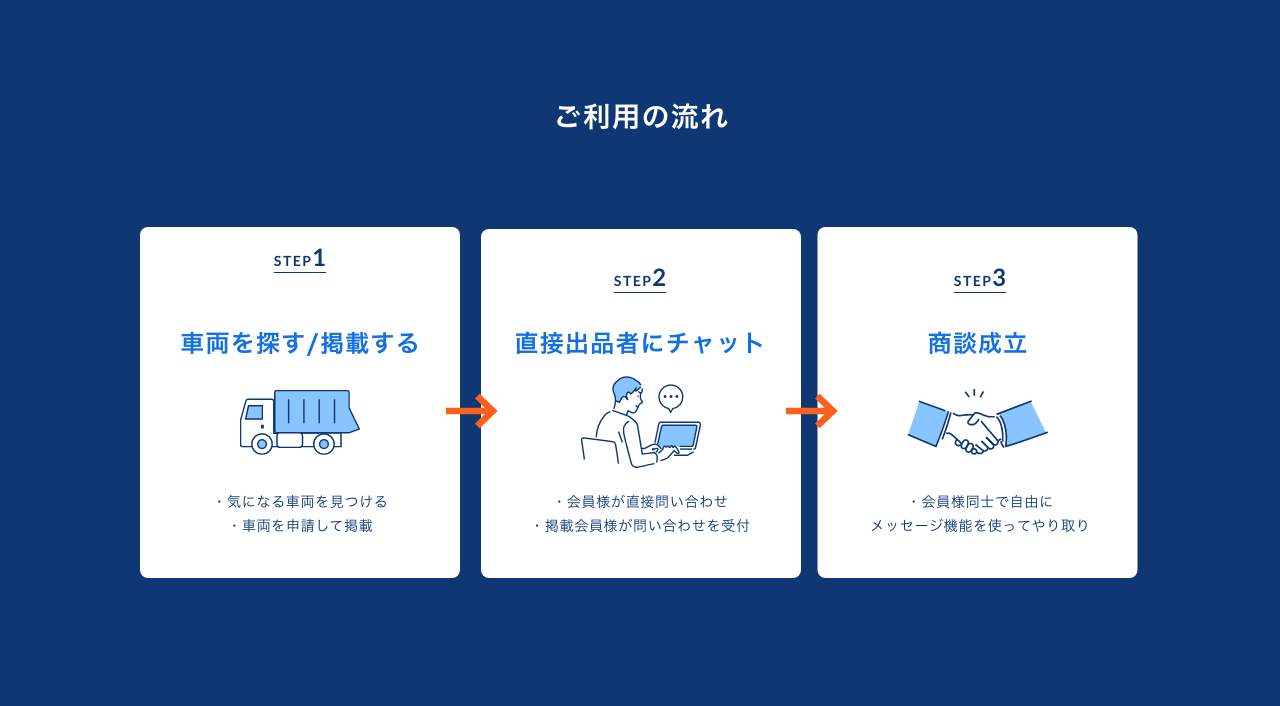 トラックは乗用車と違って、ユーザーの希望する仕様が細かく異なります。載せる荷物に合わせ、箱内の高さや幅、積載重量、異なる開閉タイプ、パワーゲート、冷凍機能、エアサス等が必要になります。そのため、「欲しい」と思ったトラックがどこへ問い合わせても簡単には見つからない、ということが頻繁に発生します。その現状に新しいソリューションを、このサービスを通して提供いたします。