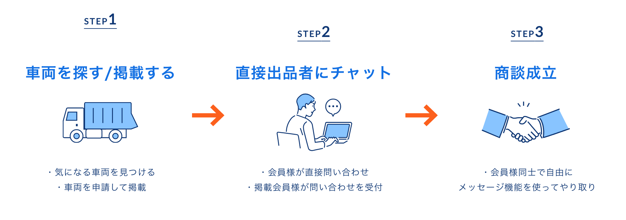 これまでの売買データを用いたAI査定機能により、トラックの適切な売却価格を瞬時に自動提案します。当該機能により、中古トラックの売却をもっと手軽に利用者が行えるようになります。トラックを探しているかたと売主が直接マッチングしてトラックの売買を行うことができます。