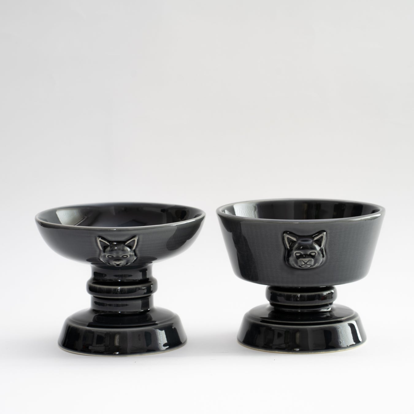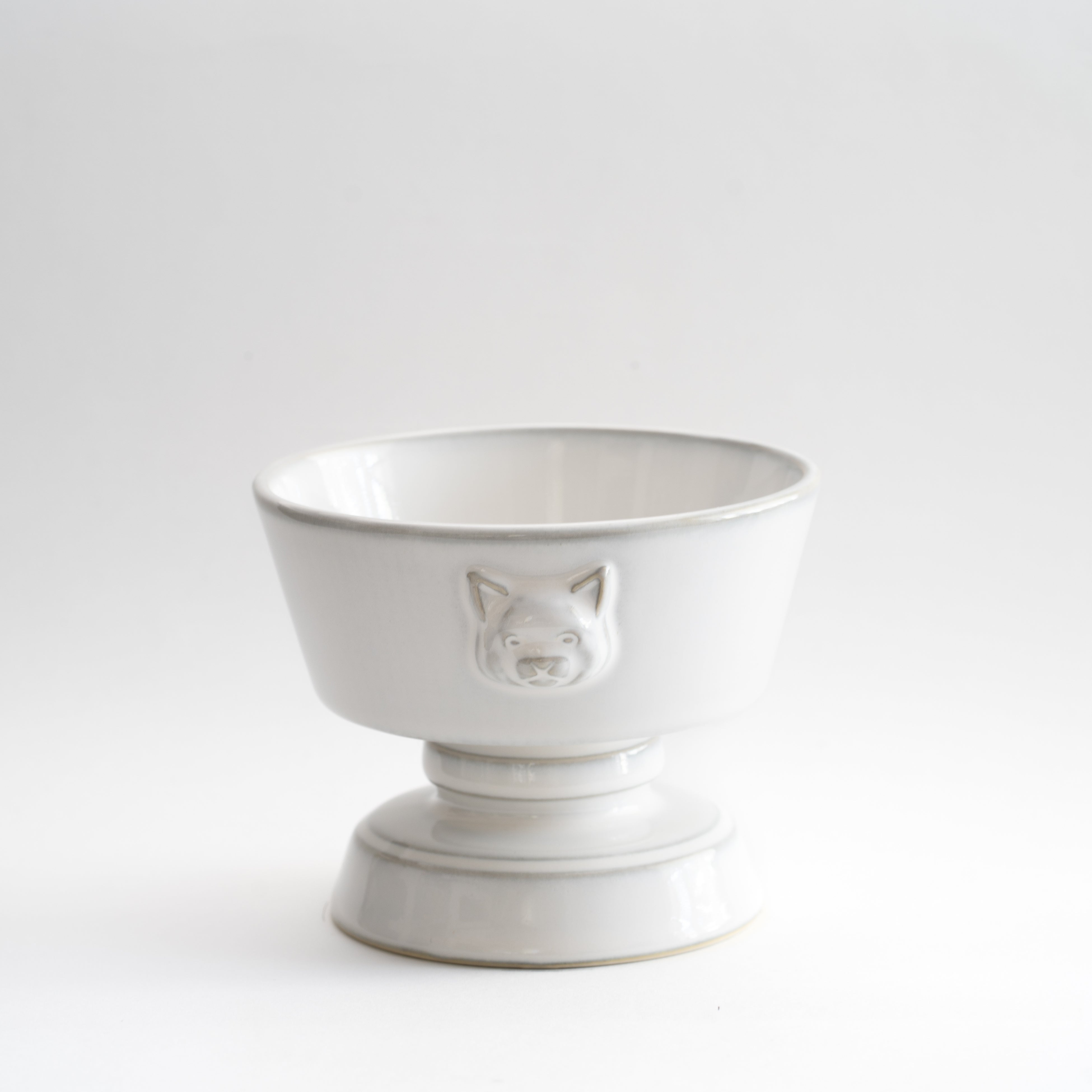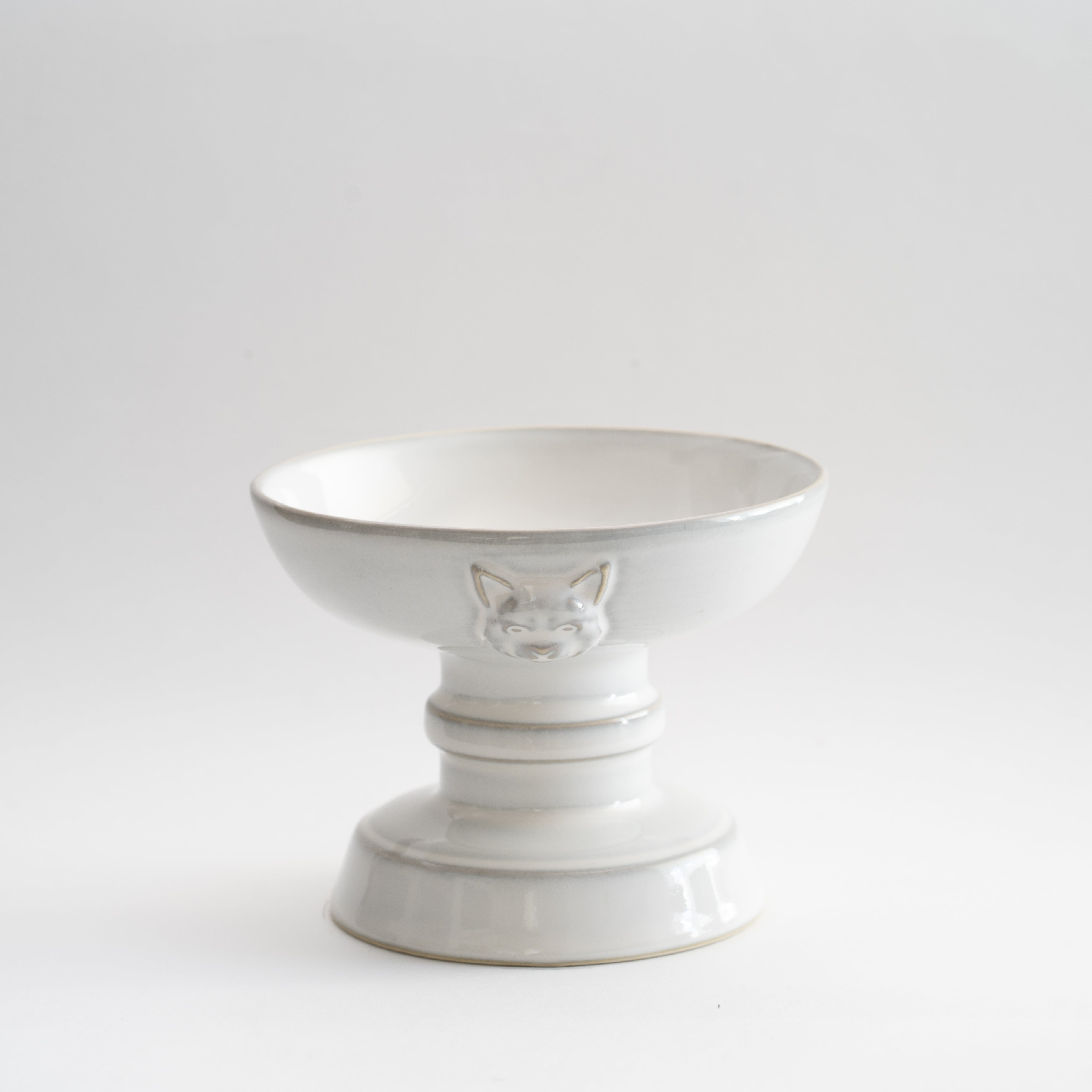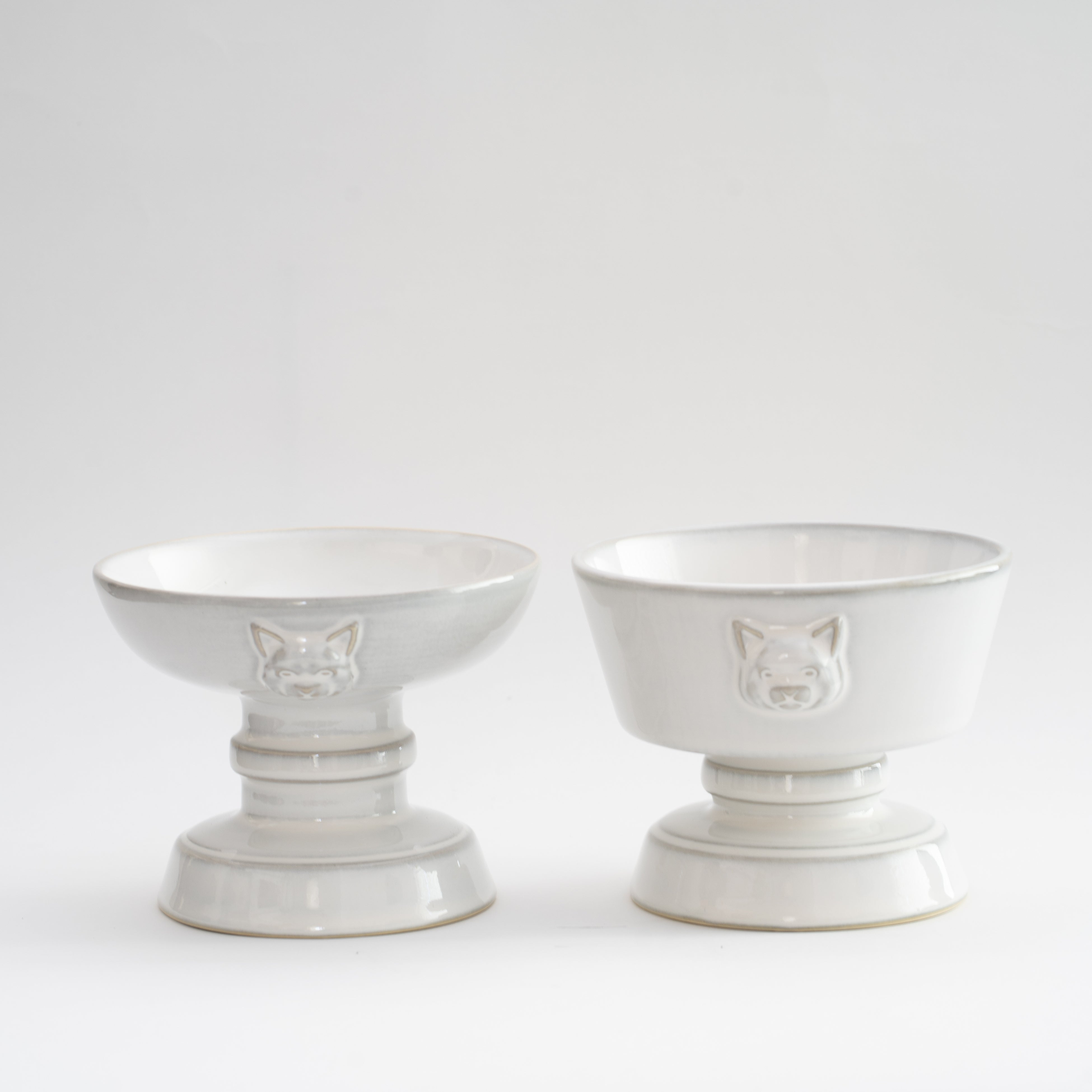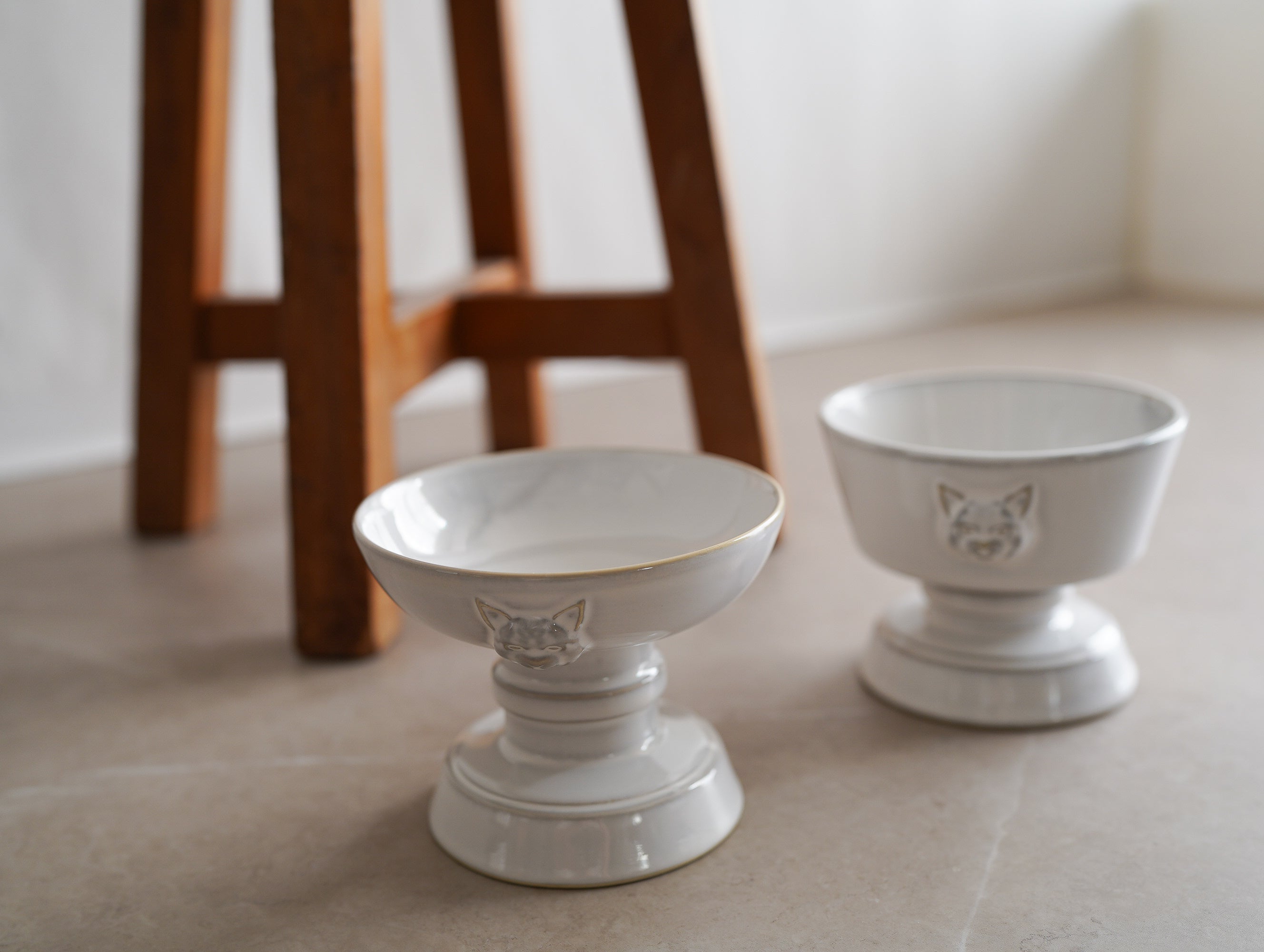 今回販売するフードボウル/ウォーターボウルはヴィンテージのコンポート皿をイメージしたデザイン。お部屋に置いていてもペット用品に見えず、インテリアに溶け込みます。猫さんの食事中に足腰の負担がかからないよう高すぎず・低すぎない設計。