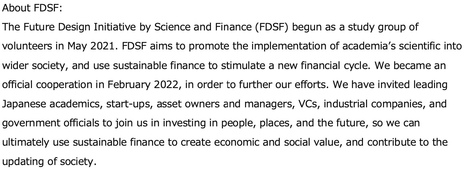 一般社団法人科学と金融による未来創造によるイニシアティブ|Future Design Initiative by Science and Finance (FDSF)は、2021年5月より有志の勉強会から始まりました。アカデミアのサイエンス・ナレッジを社会に実装する取り組みとサステイナブルファイナンスを通じた新しい資金循環の促進を目指し、大学等との連携を通じて必要な科学技術と金融を繋ぐ人材の育成、資金供給の仕組み等について議論してきました。その活動を更に加速化するべく、2022年2月に法人化しました。日本を代表するアカデミア、スタートアップ、アセットオーナー、アセットマネージャー、VC、事業会社、政府関係者の方々に参画いただき、サステイナブルファイナンスによる経済的価値と社会的価値の創出にシームレスに取り組み、社会のアップデートに貢献するための、場づくり・人づくり・未来への投資を実現します。