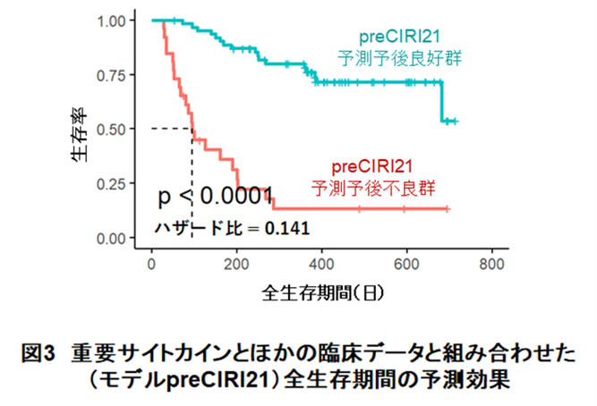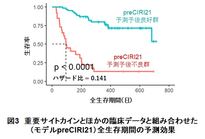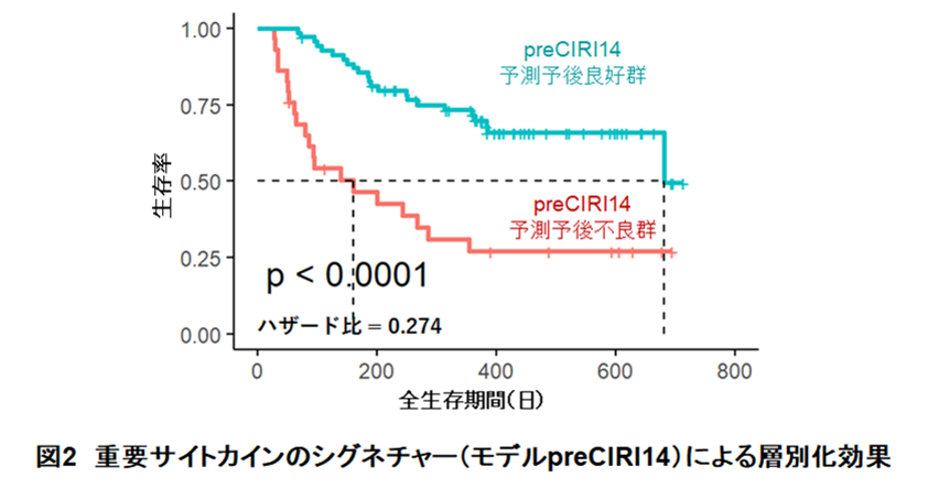 機械学習により抽出された14種の重要サイトカインの濃度を用いて、全生存期間の予測モデル(preCIRI14)を構築しました。このモデルにより計算された予測リスクスコアを用いると、予後良好群と予後不良群の間に全生存期間の有意な違い(P<0.0001)が確認され、治療効果の高い患者を高精度に予測できることが判明しました(図2)。