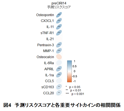 preCIRI14モデルを用いて算出された免疫治療効果の予測リスクスコアと各重要サイトカインとの相関関係を調べたところ。Osteopontin、CX3CL1、IL-11など大半のサイトカインは予測リスクと正の相関を示し、予後不良群に濃度が高いという傾向が確認されました(図4)。このように、免疫治療をうけるがん患者において各サイトカインの重要性を検討することは抗腫瘍免疫のメカニズム解明や新規治療法の開発に貢献すると期待されます。