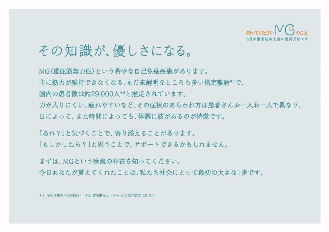 アルジェニクスジャパン株式会社(本社:東京都港区、代表取締役社長:ヘルマン・ストレンガー、以下 アルジェニクスジャパン)は、厚生労働省より難病指定を受けている希少疾患、「重症筋無力症(myasthenia gravis:以下MG)」の啓発月間である6月に、「その知識が、優しさになる。」をスローガンとしたMG啓発プロジェクト「知ってくださいMGのこと」を実施いたします。