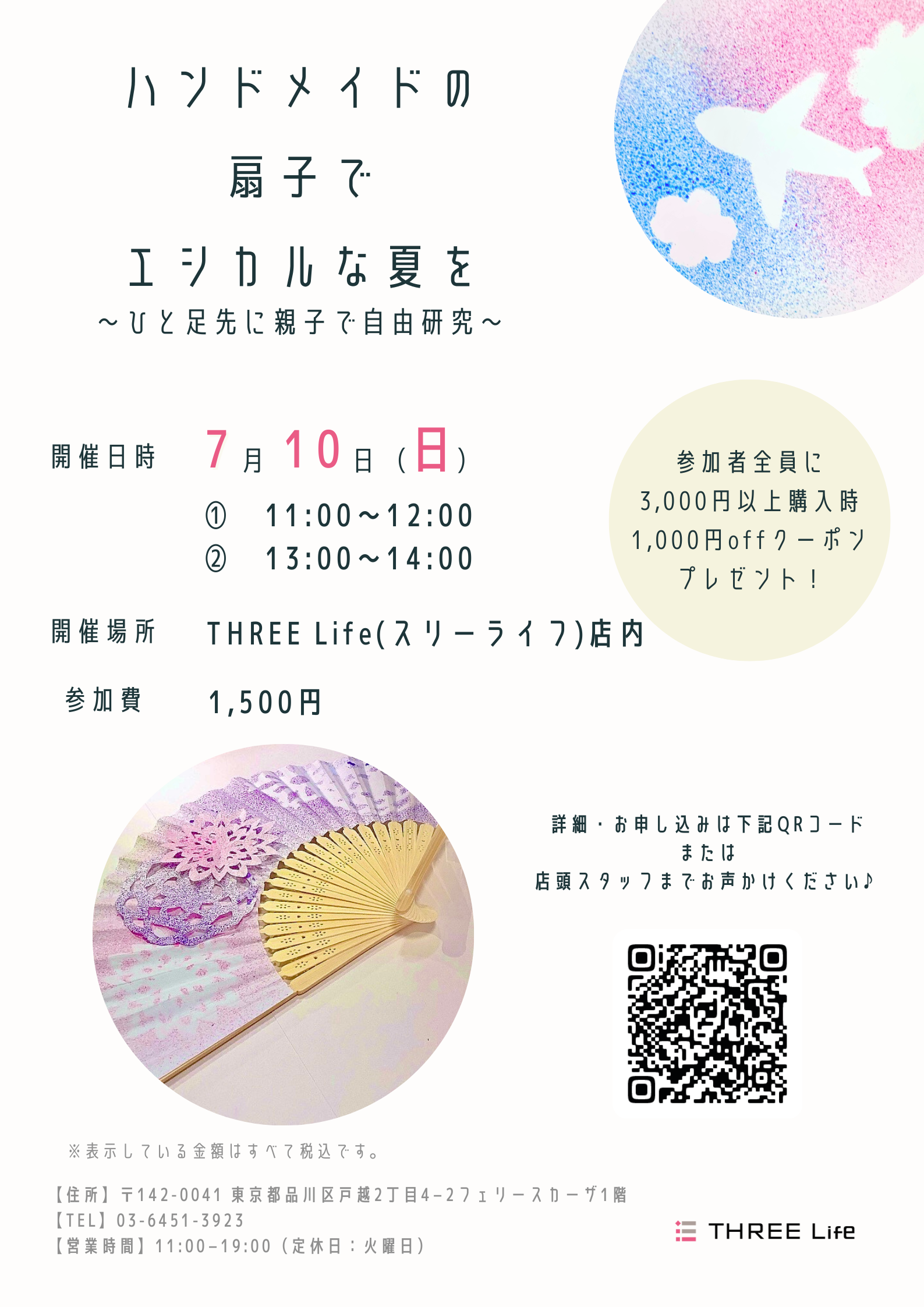 2022年7月10日に株式会社tierraが運営するエシカル系セレクトショップ「THREE Life(スリーライフ)」にて、オリジナル扇子づくりワークショップを開催いたします。