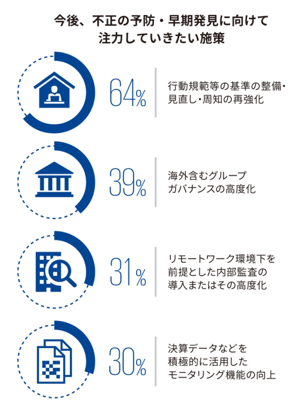 今後注力していきたい施策として、行動規範等の整備やグループガバナンスの高度化に高い関心が寄せられている。不正発生の根本原因として、「行動規範等の倫理基準の未整備または不徹底」を挙げる企業も高い割合で見受けられることから、十分な取組に至っていないことに課題認識を持つ企業が多いことがうかがえる。