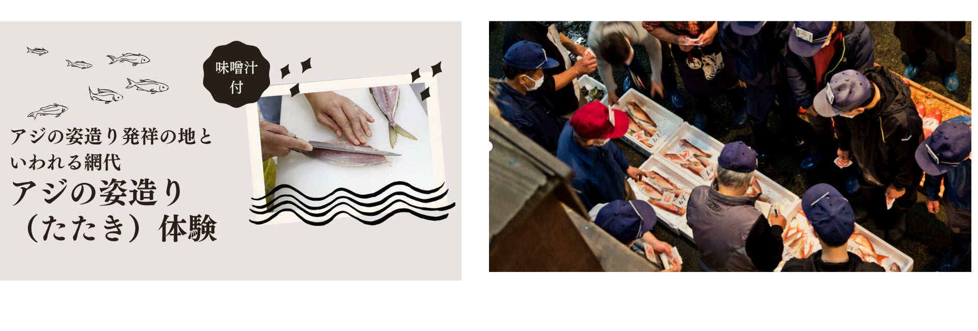 熱海の『食文化』がどうやって生まれているのか、を体感しながら、食の成り立ちを身近に感じられるプログラムです。熱海で穫れる食材を活用した料理について、新しい気づきがある体験ができます。熱海の魅力の1つでもある干物やお造りを、地元の方と一緒に捌いたりセリに参加することで、食の大切さに気づくとともに食文化の継承を目指したコンテンツです。