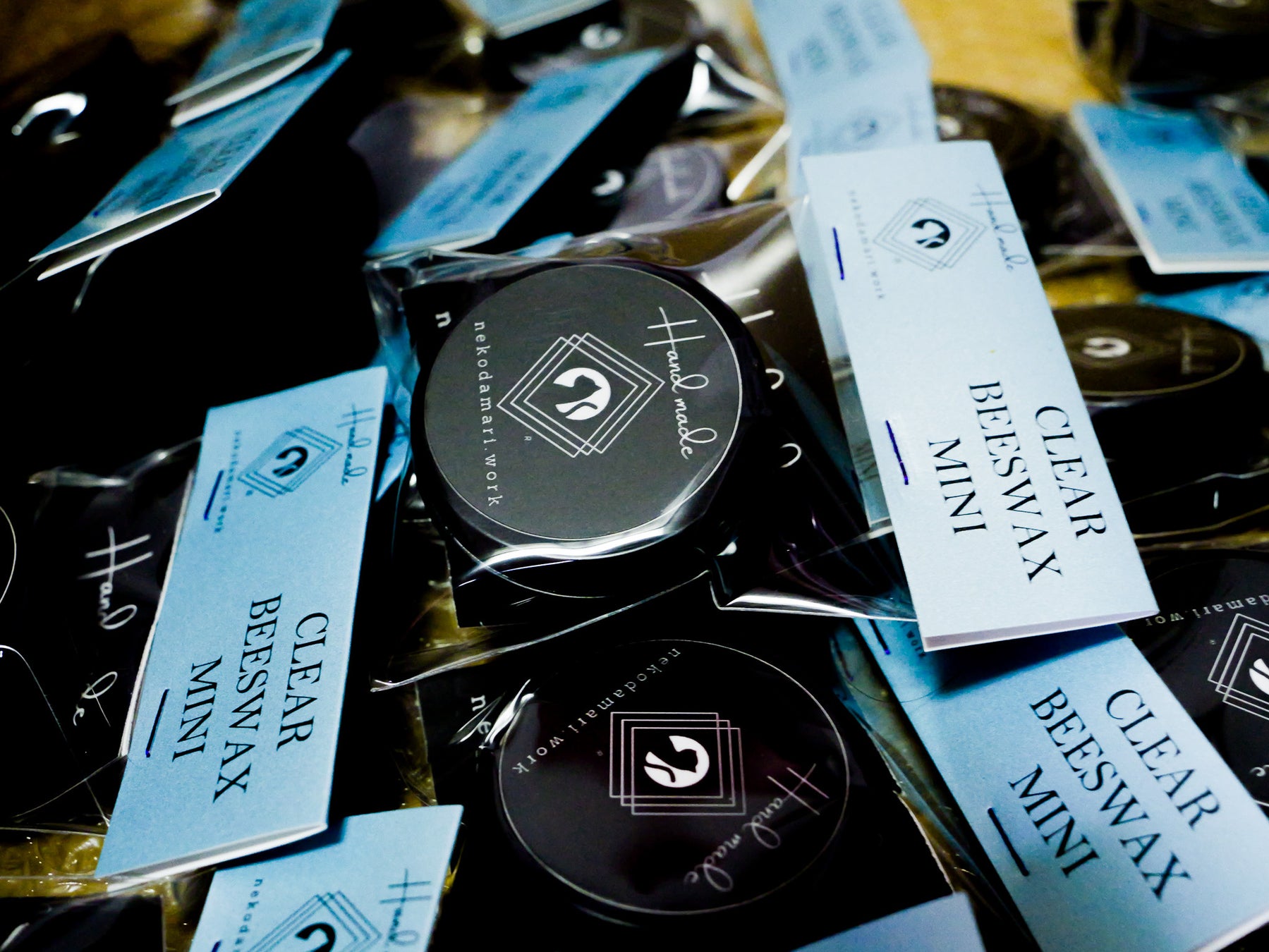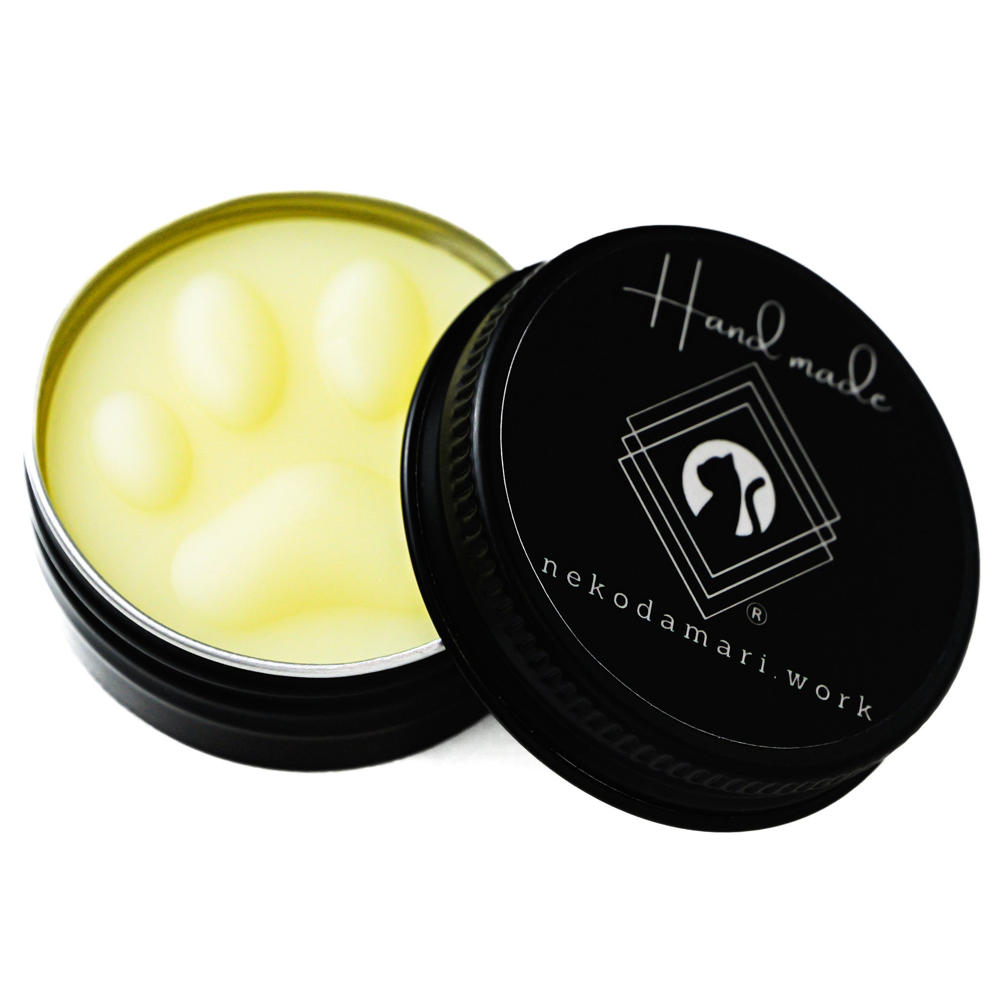 ねこだまり工房誕生のきっかけでもある『クリア蜜蝋ワックス』がハーフサイズになりました。遊び心を凝らして、ワックス面に肉球のエンボスを採用。思わず触りたくなるデザインに仕上げました。