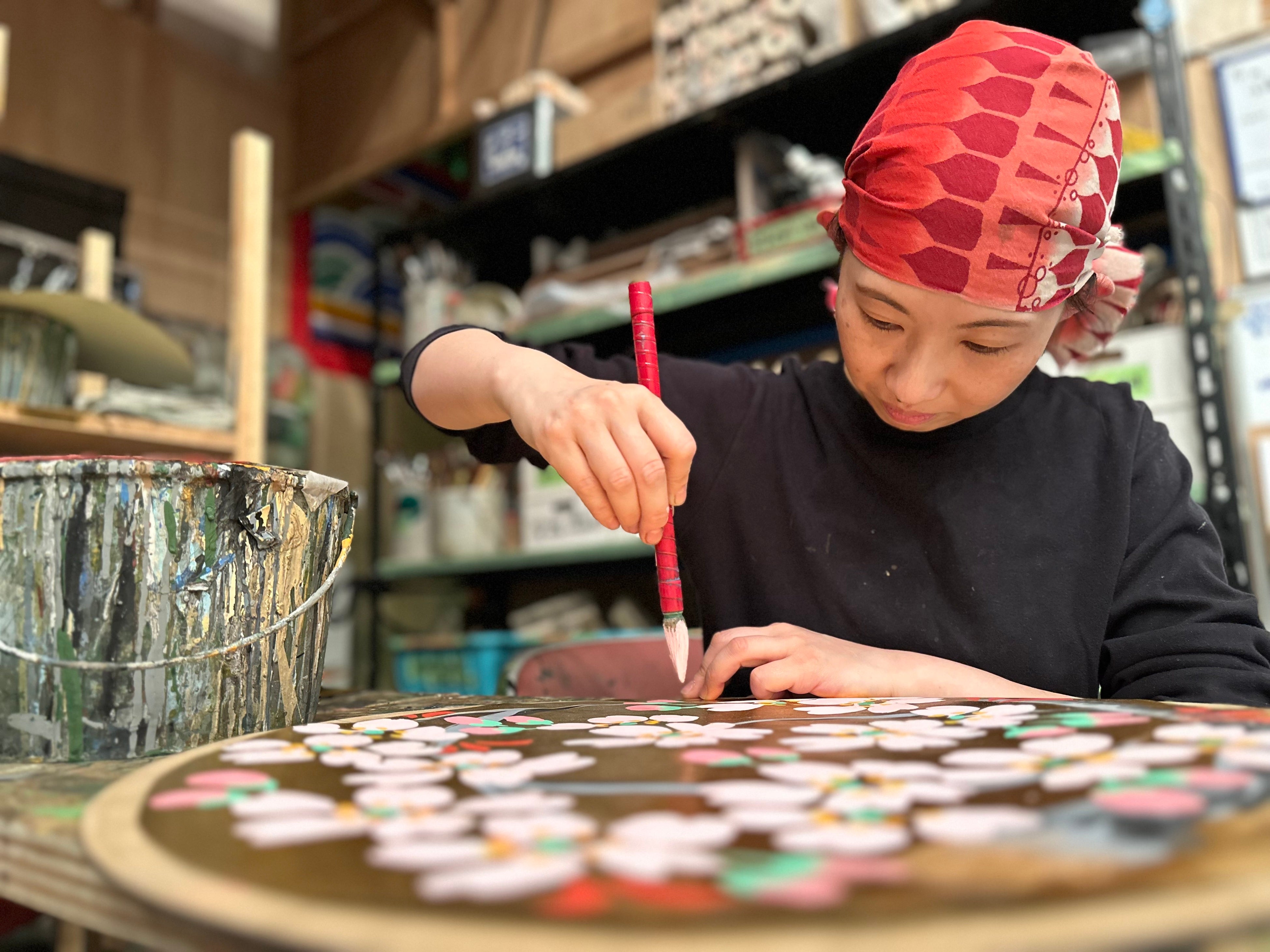 ワークショップでは、歌舞伎の舞台美術に登場する壁装飾のひとつ「花丸」を、実際の塗料を用いて講師と一緒に金色紙に描きます。