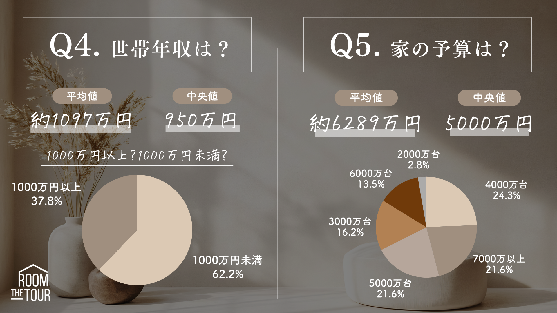 実際の回答には、「年収650万円で家の予算4,150万円(土地+建物+外構)」「年収1,200万円で予算5,000万円」「年収1,500万円で予算1億円」などリアルな声が寄せられました。