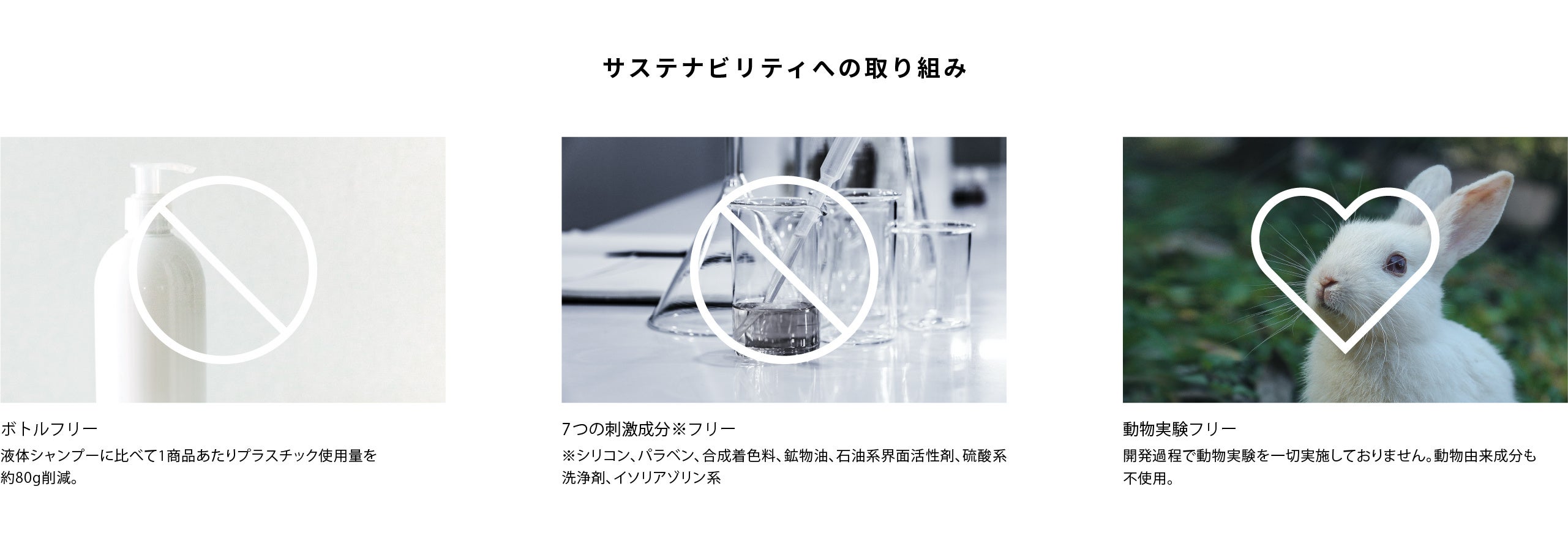 ボトル不使用によって1商品あたり従来の液体シャンプーと比べて約80gのプラスチック使用量を削減。シリコン、パラベン、石油系界面活性剤等の7つの刺激成分フリー。開発過程では一切の動物実験を行わず、動物由来の成分も使用しておりません。