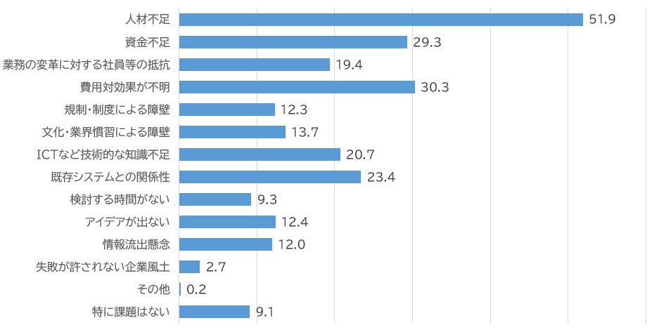 一方で、中小企業のデジタル化が進まない主な理由として、「人材不足」「業務の変革に対する社員等の抵抗」「ICTなど技術的な知識不足」など、「人」に関する課題が挙がっています。特に、中小企業は、ITやデジタル対応業務について、専任の担当者がいないことや、他業務との兼務が多いため、日々の業務に追われ、デジタル化など新しいことに時間を十分な時間を割けない現実もあります。