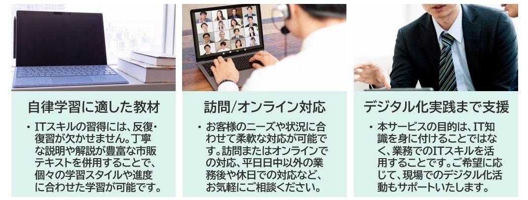 若手社員は、ミドルシニア社員にリーダーシップや豊富な経験に基づく判断能力を求めています。しかし、ベテラン社員が会社が進めるデジタル化についていけずに実践部分を若手社員に任せがちで、結果として、デジタル化したことが若手社員の業務過多につながっているという話を耳にすることがありました。ベテラン社員も、若手社員の負担になっていることに問題意識を持ちながらも、IT・デジタルに対して自信を持てず、なかなか行動につなげられない状況がありました。