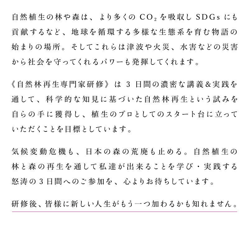 気候変動危機も、日本の森の荒廃も止める。自然植生の林と森の再生を通して私達が出来ることを学び・実践する。今年で12回を迎える《自然林再生専門家研修2022》怒涛の3日間のご案内です。