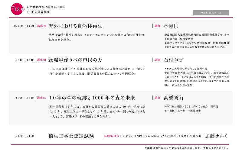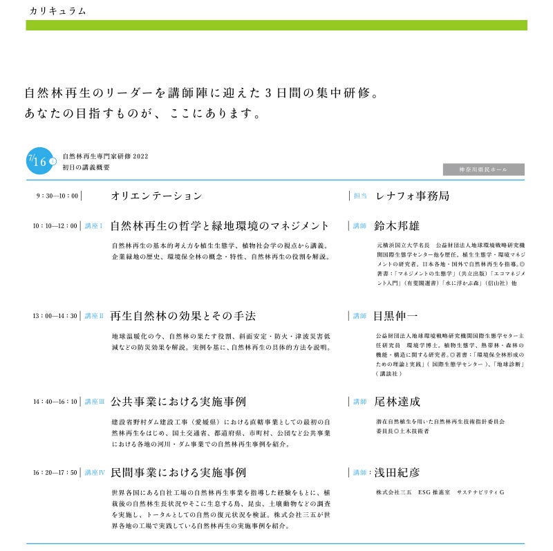 今年で12回を数えるNPO法人国際ふるさとの森づくり協会(レナフォ)主催の《自然林再生専門家研修》は3日間の濃密な講義&実践を通して、科学的な知見に基づいた自然林再生という試みを自らの手に獲得し、植生のプロとしてのスタート台に立っていただくことを目標としています。