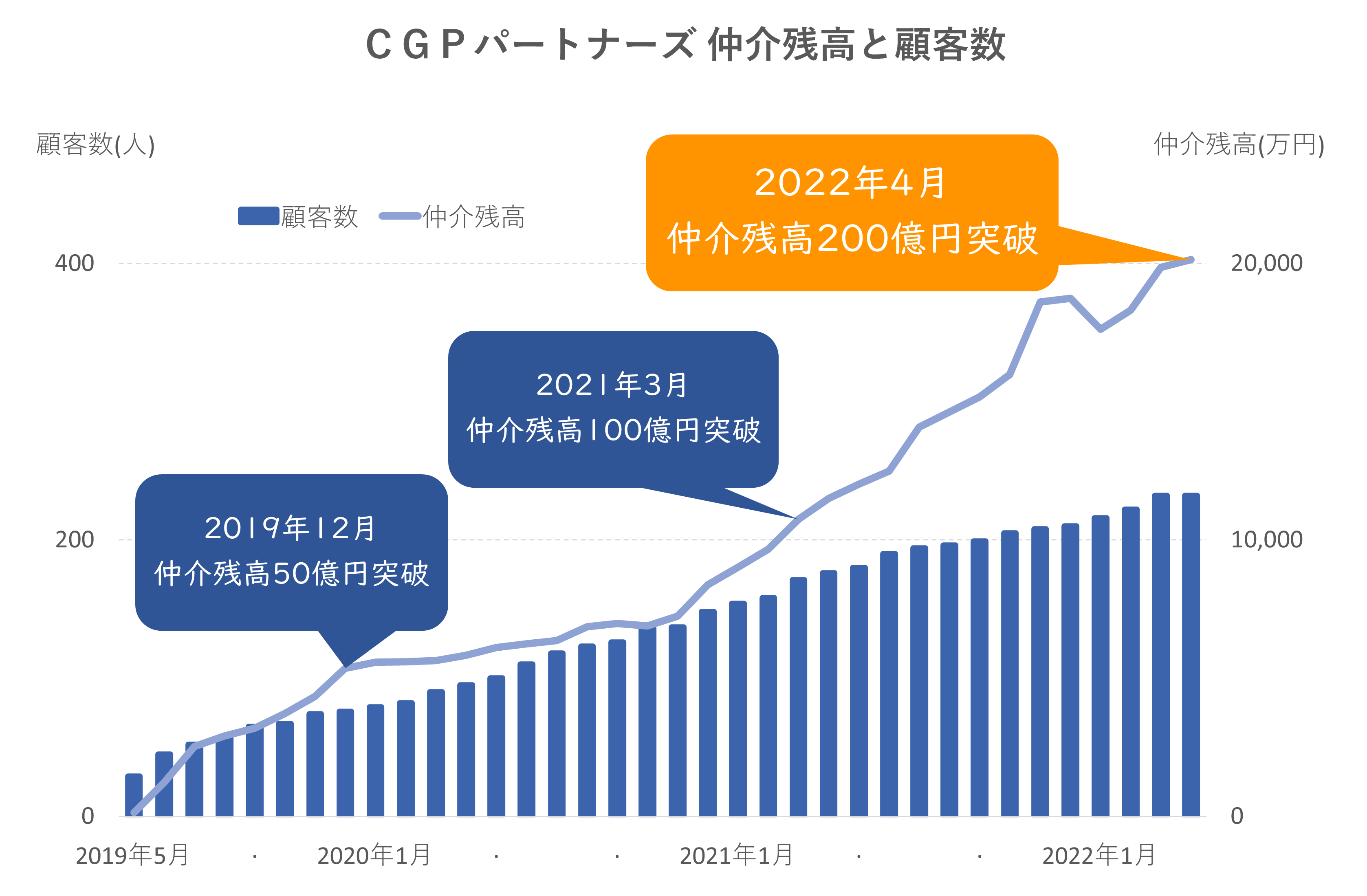 プライベートバンキング業務を行うIFA法人(独立系フィナンシャルアドバイザー)のCGPパートナーズ株式会社(本社:東京都千代田区、代表取締役 野上大輔、以下「CGPパートナーズ」)は、厳しい市場環境下にもかかわらず順調に営業拡大を進め、このたび事業開始から3年目となる2022年4月末時点で、金融商品仲介残高が200億円を突破しました。