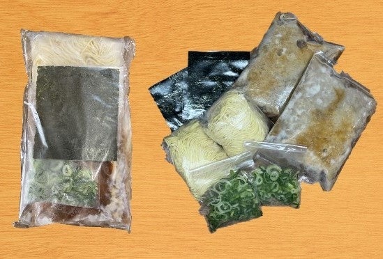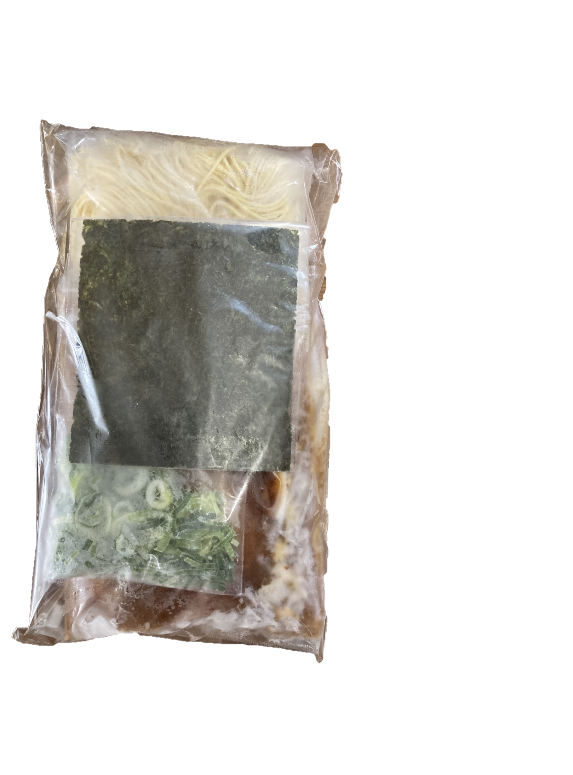 ★冷凍スープの中にチャーシュー・メンマが入っており、麺は冷凍生麺、具材として京都の九条ネギと海苔が入っています。