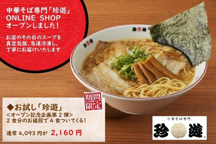 中華そば専門「珍遊」ではお店で作ったその日のスープを急速冷凍、真空包装しオンラインショップで冷凍中華そばとして2022年5月26日から販売しております。珍遊は、創業70年、老舗京都ラーメンの源流と呼ばれるラーメン店で、京都では多くの方に知っていただいているお店ですが、インターネット通販では全く知られていない、新参者という事実を目の当たりにしました。まずはお気軽に他府県の方に珍遊の中華そばを実食していただきたいという思いから、2食分の価格で4食ついてくる【お試し珍遊】を開始いたしました。年齢、男女問わず、またお子様も好んで食べていただける中華そばですので、ご家族分セットいたしました。