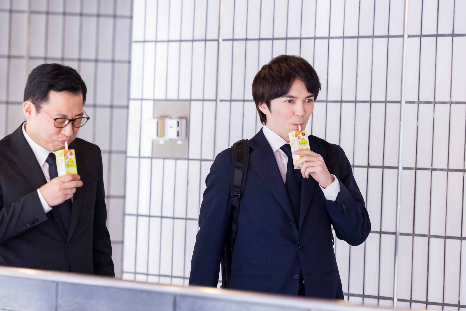 ズレた真⾯⽬な営業マン役・林さんと、ポーカーフェイスの取引先役・加納さん “飲む理由”を場違いに語る林さんと表情を変えないクールな加納さんのギャップに注⽬