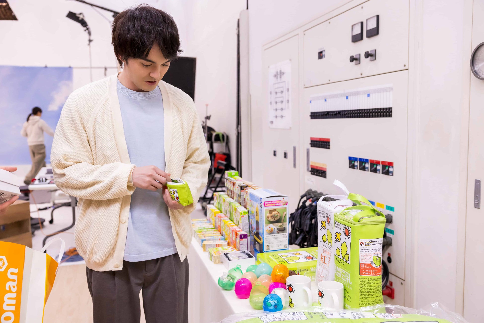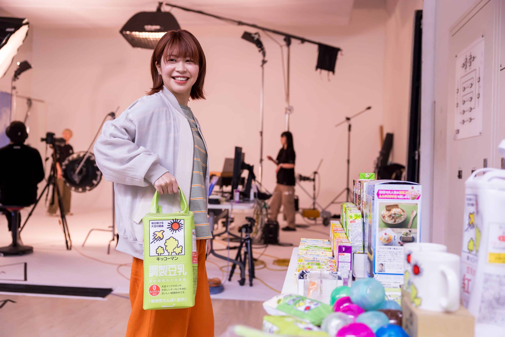 グラフィック撮影後に林さん、加納さんにキッコーマンソイフーズよりキッコーマン⾖乳グッズをプレゼント。⾖乳の種類の多さやユニークなグッズにお⼆⼈とも興味津々。林さんは⾖乳のロゴが⼊ったTシャツをピックアップ。「これもいいんですか︕︕」と持ち帰るグッズを選びながらテンションが上がっている瞬間が⾒られました。加納さんは、なかなか⾒ることがないレアな商品とのことで、アフォガートとチャイティーの味の⾖乳やバッグをピックアップ。撮影ではシュールに佇んでいるキャラを演じていましたが、その後、コップやガチャガチャのグッズをすごい速さで持ち去ってはイタズラに壁から顔をだすお茶⽬な様⼦も伺えました。