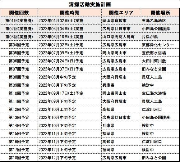 そこで、投稿写真をもとに清掃活動候補地を選定して、海辺のボランティア清掃活動「プラスワン クリーンアッププロジェクト」を実施しております。なお、今回の第2回・第3回清掃活動は、それぞれ広島県・山口県では初の実施となります。