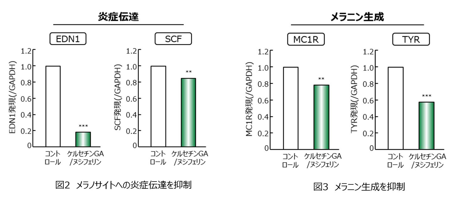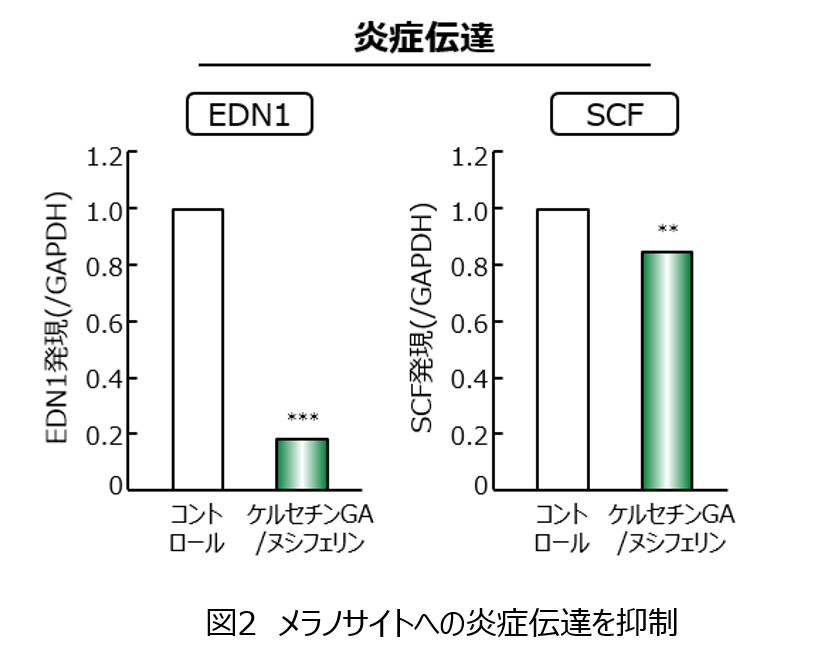炎症により表皮細胞のメラノサイト刺激因子が活性化すると、炎症シグナルがメラノサイトに伝わります。同成分は、メラノサイト刺激因子(EDN1・SCF)の発現を有意に抑制します(図2)。